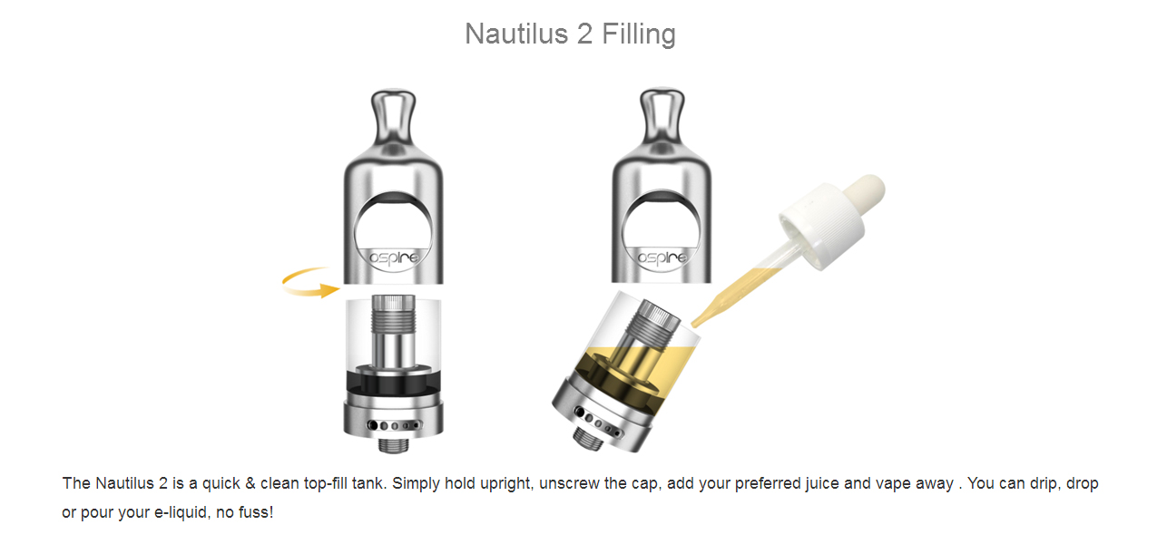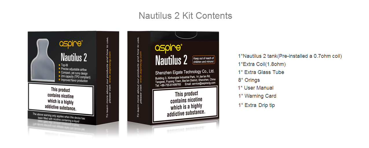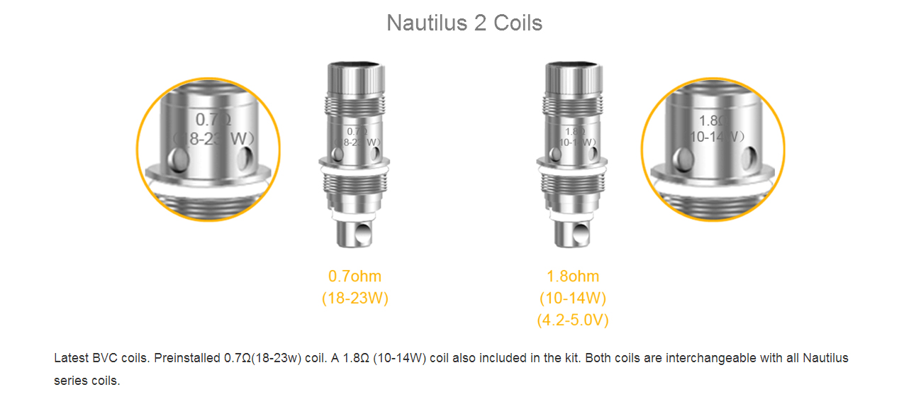 Aspire brings you the new, curvy, Nautilus 2, the latest mouth to lung 2ml tank in the Nautilus series. Nautilus 2 employs a pre-installed, 1.8ohm BVC coil, coupled with the bottom air flow adjuster, helping you to fine tune your vaping needs. Shorted chimney minimizes airflow travel and provides a better flavor experience, bringing the best out of your premium e-juice. Interchangeable coils with other Nautilus tanks, further individualizes your vaping experience.
