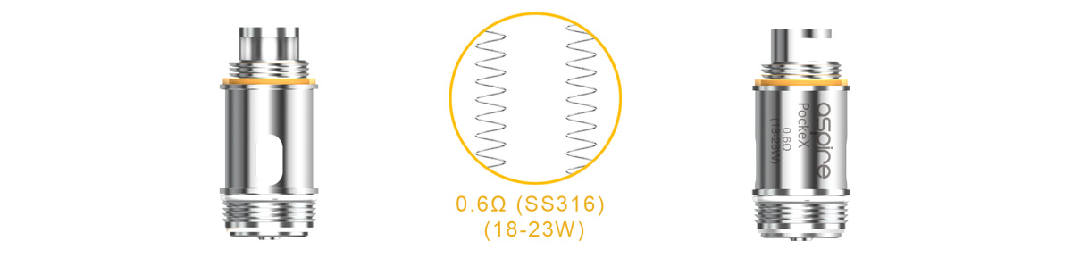 Rated 18-23 watts, the PockeX Atomizer has a 0.6ohm 316L stainless steel coil. The PockeX adopts U-Tech coil technology.