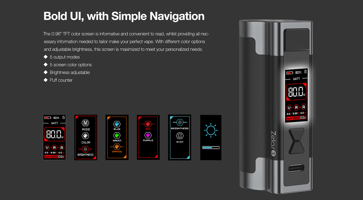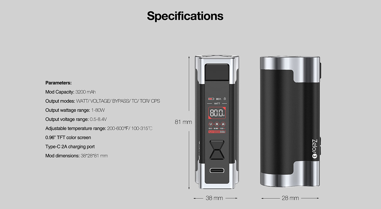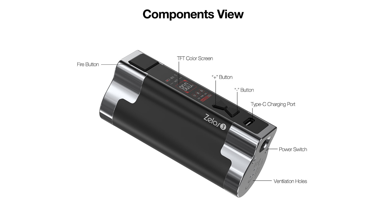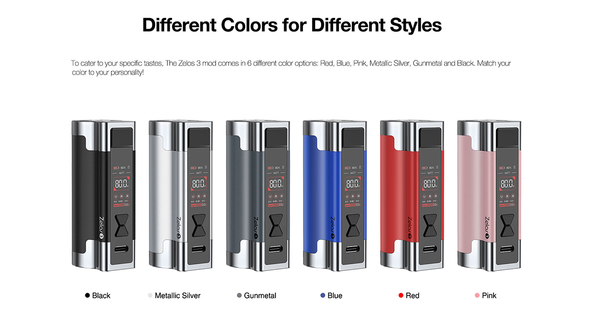 Aspire Zelos 3 Mod is constructed from sturdy but lightweight Aluminum alloy and zinc alloy through the oxidation process, the ergonomic design is easy to hold. Aspire Zelos 3 Mod features built-in 3200mAh battery with 80W max output. With a 0.96″” TFT color screen, you can adjust UI color and brightness. What’s more, Aspire self-developed smart ASP chipset system would ensure your safety and deliver better vaping experience with WATT/ VOLTAGE/ BYPASS/ TC/ TCR/ CPS mode..