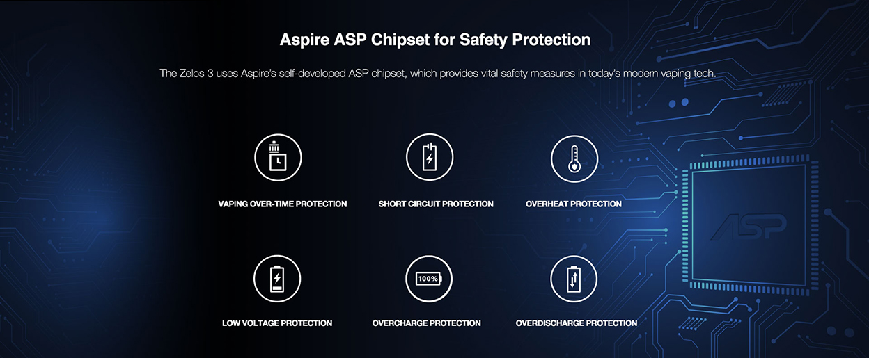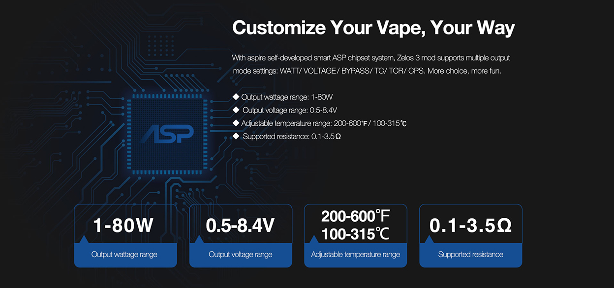 Aspire Self-developed Smart ASP Chipset System Would Ensure Your Safety And Deliver Better Vaping Experience With WATT/ VOLTAGE/ BYPASS/ TC/ TCR/ CPS Mode.