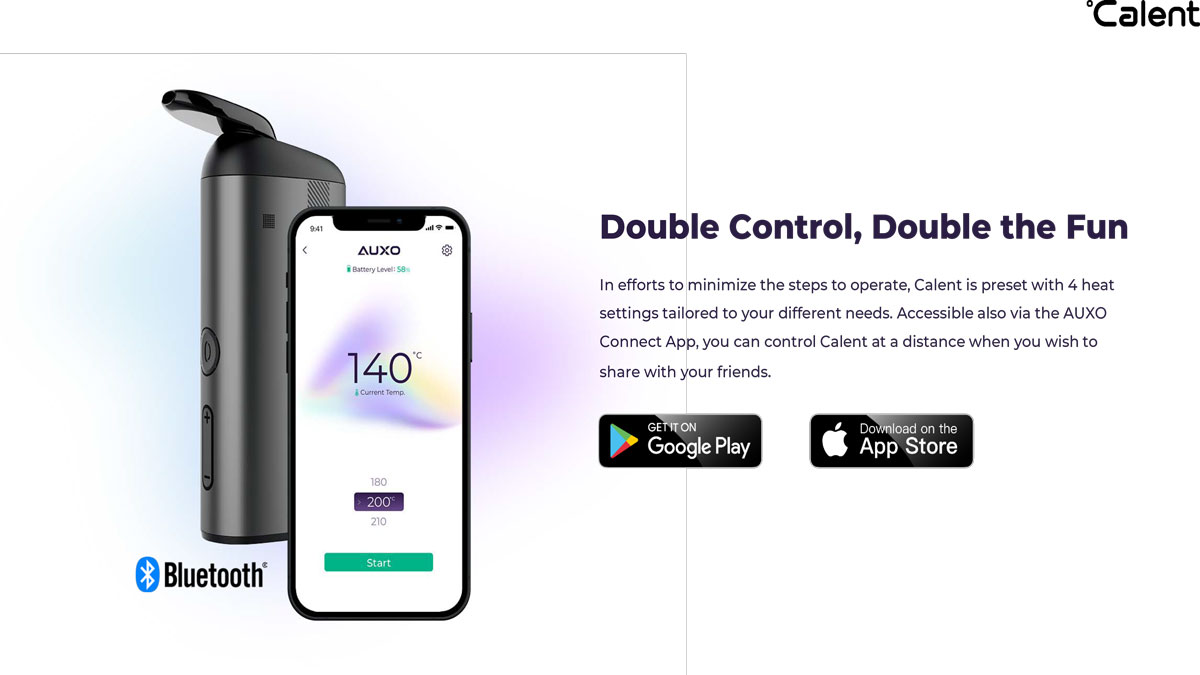 In efforts to minimize the steps to operate , Calent is preset with 4 heat settings tailored to your different needs . Accessible also via the AUXO Connect App , you can control Calent at a distance when you wish to share with your friends.