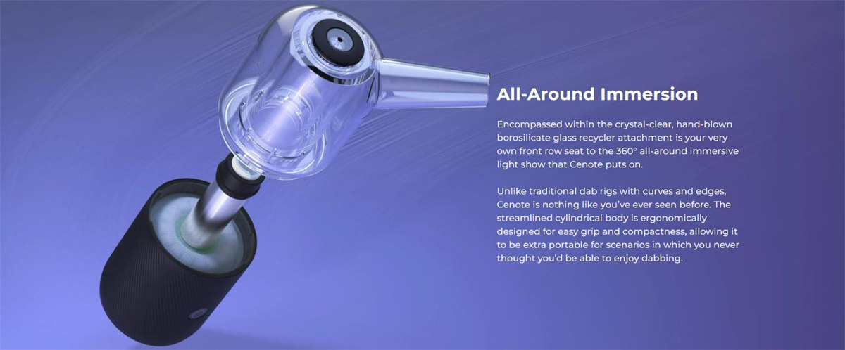 Encompassed within the crystal-clear, hand-blown borosilicate glass recycler attachment is your very own front row seat to the 360degree all-around immersive light show that Cenote puts on.
