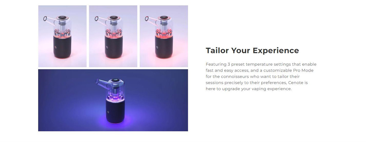 Featuring 3 preset temperature settings that enable fast and easy access, and a customizable Pro Mode for the connoisseurs who want to tailor their sessions precisely to their preferences, Cenote is here to upgrade your vaping experience.