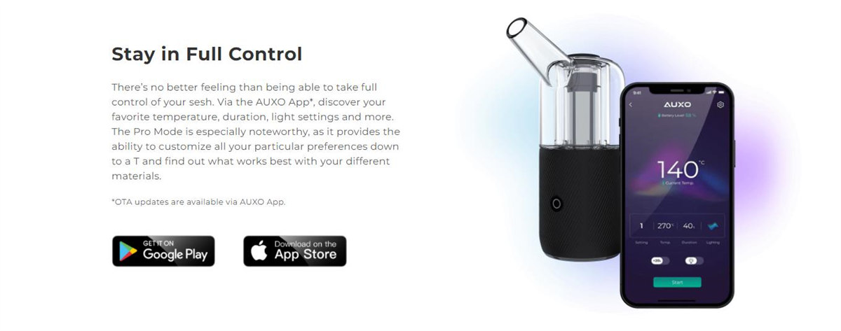 There’s no better feeling than being able to take full control of your sesh. Via the AUXO App*, discover your favorite temperature, duration, light settings and more. The Pro Mode is especially noteworthy, as it provides the ability to customize all your particular preferences down to a T and find out what works best with your different materials.