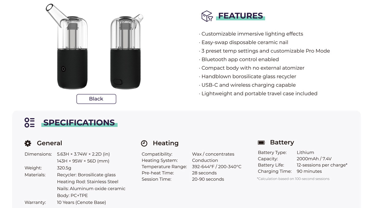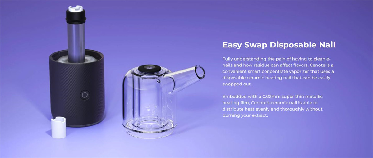 Fully understanding the pain of having to clean e-nails and how residue can affect flavors, Cenote is a convenient smart concentrate vaporizer that uses a disposable ceramic heating nail that can be easily swapped out.
