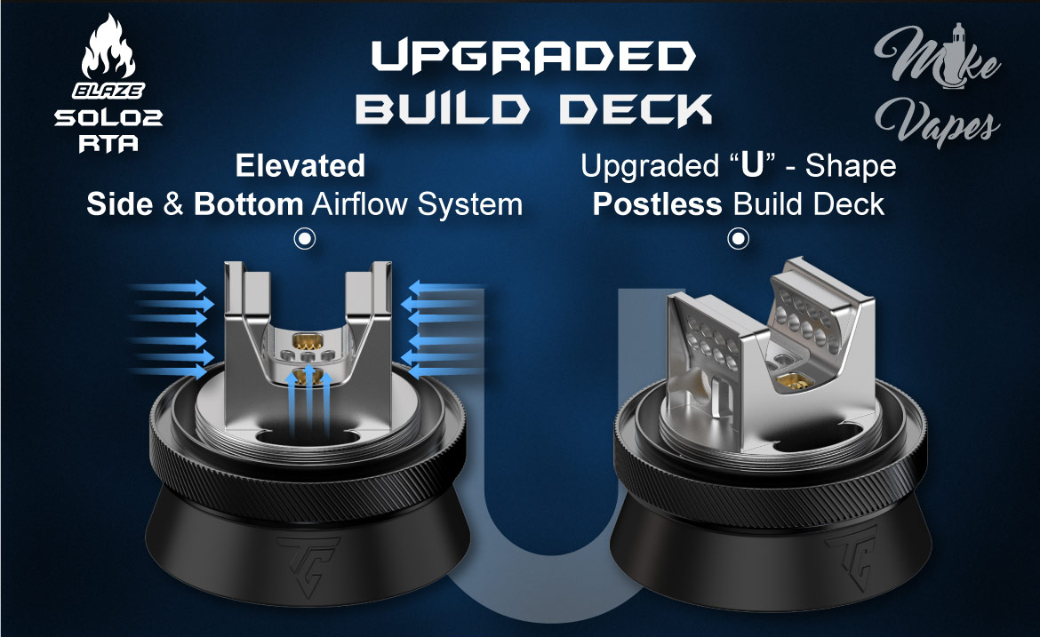 Blaze Solo 2 RTA By ThunderCloud And Mike Vapes Features A 25mm Design, 5.5ml Bubble Glass, Postless U-shaped Deck, And 122 Honeycomb Airflow Inlets For Leak-proof, Flavor-rich Single Coil Performance.