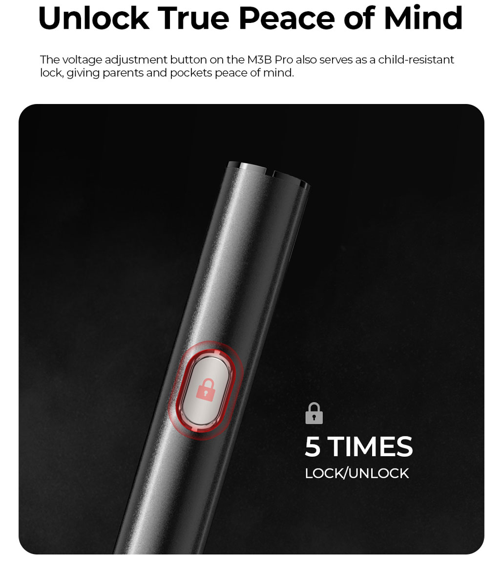The M3b comes with a child-resistant lock feature, and is the ideal compact vape pen to indulge in as it provides you peace of mind. M3b Pro, powered by its micro sensor, enables you to activate the battery with a simple inhalation.