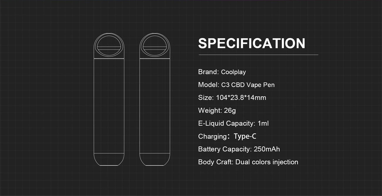 The Coolplay C3 CBD Vape Pen is Safety, Purity, and Consistency,built-in 250mah battery.Dual Color Injection Craft Crystal housing, dual color injection craft,slim and protable,Fully visible oil tank to ensure that every bite is pure. type-c fast charging.