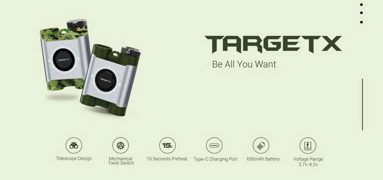 TargetX Is A Box Mod That Is Armed With A 650mAh Rechargeable Battery And A Voltage Adjustment Dial On The Top. It Can Match Most Of All The 510 Thread Oil Vaporizers.