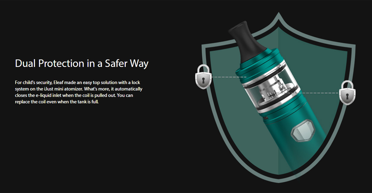 For Child’s Security, The Eleaf IJust Mini Atomizer Features A Completed Childproof System Which Allows Easy Filling And Improved Leak Protection. To Perfectly Pair With It, The IJust Mini Atomizer Utilizes Two Brand-new GT Coils Which Are Thread-free And Very Easy To Install.