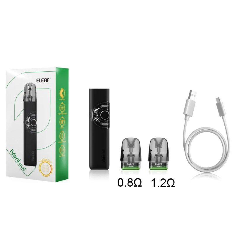 The Eleaf IVeni Duo Pod System Kit Features A 1300mAh Battery, 8–40W Output, DuoCore Dual-mesh Pods, Color Screen, Spinner Fire Button, And Adjustable Airflow—perfect For Tailored MTL/RDL Vaping.