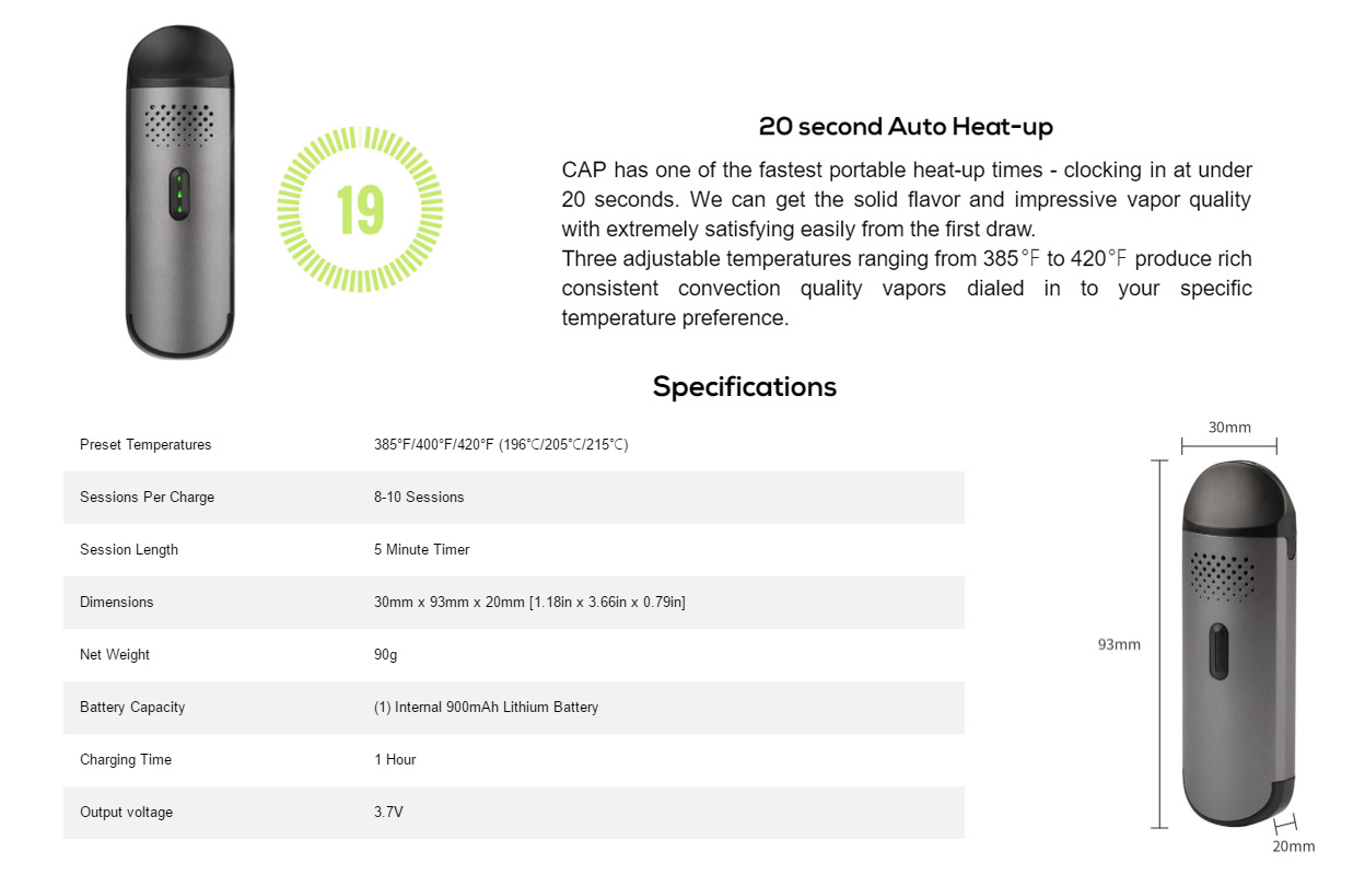 At Flowermate it’s our mission to develop a healthy and affordable alternative to combustion. Introducing a Drying aromatherapy device 5 years in the making. The CAP features three preset temperatures and our newly developed glazed stainless steel conduction heating technology. This new technology is designed to heat up in less than 20 seconds and is our smallest device in our product family.
