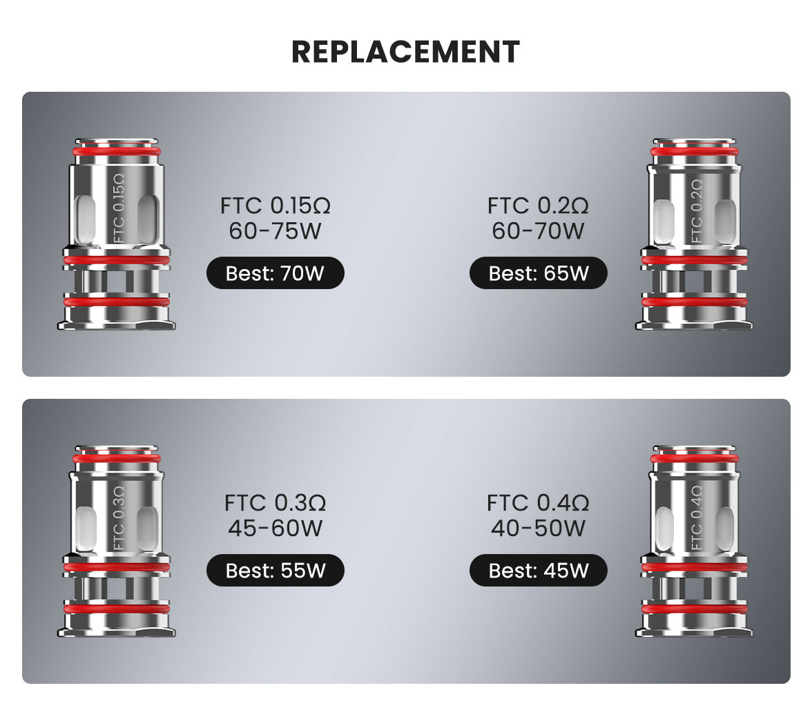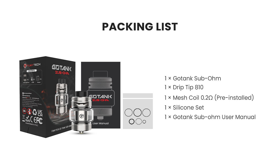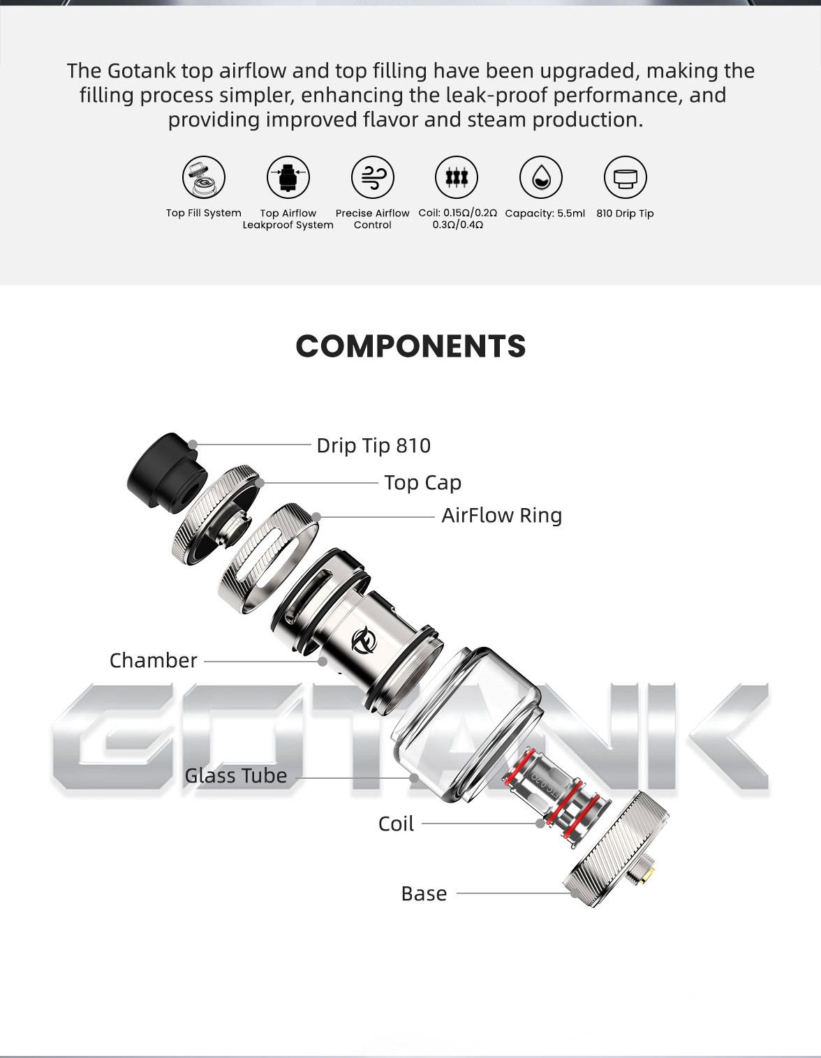 The Fumytech Gotank comes with a 5.5ml e-juice capacity. The āātop-push cover refill designāā allows vapers to simply slide the drip tip-integrated cap and inject e-liquid seamlessly, ensuring leak-free convenience.This āāSub Ohm Tankāā features āāadjustable wide airflowāā to tailor your vaping experience, now enhanced by compatibility with āāFTC Series Coils (0.15/0.20/0.30/0.40ohm)āā. Designed for cloud chasers, the low-resistance coils and optimized airflow synergize to deliver āāmassive vapor productionāā, making it an ideal choice for enthusiasts prioritizing thick, dense clouds.