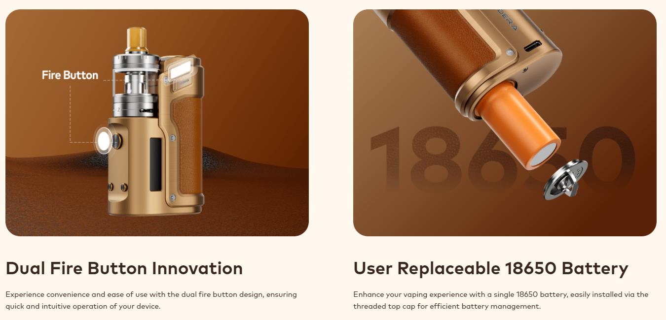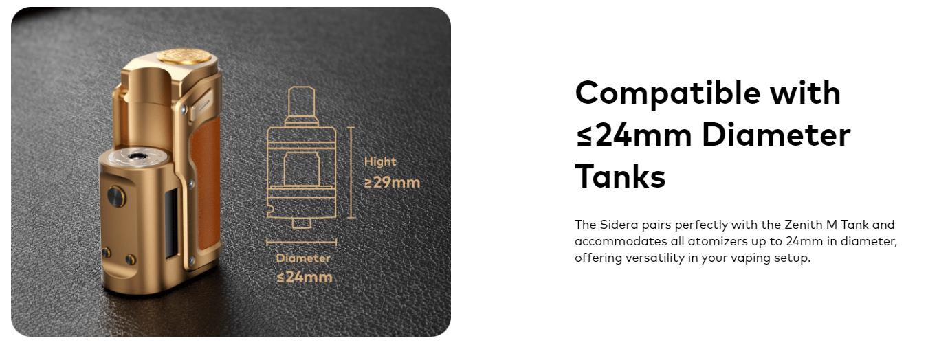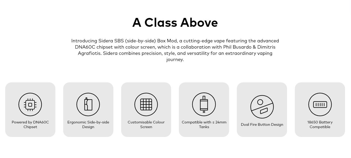 Sidera SBS (side-by-side) Box Mod, A Cutting-edge Vape Featuring The Advanced DNA60C Chipset With Colour Screen, Compatible With All Tanks Up To 24mm.