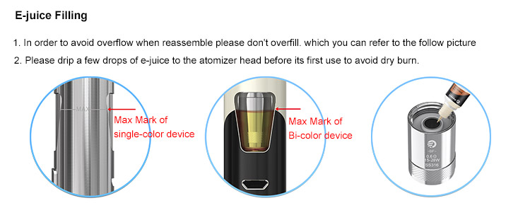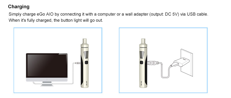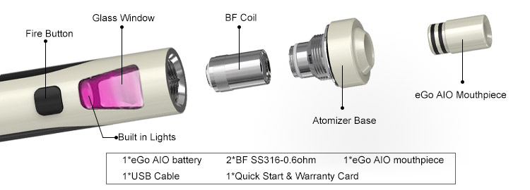 eGo AIO, being all-in-one style, attaches the best anti-leaking structure with 2ml e-juice capacity. It applies childproof systems: pressure twist cap of tank and five-click fire button of power supply. It is simple and convenient in use, but fashionable in look of several mixed colors and indicator light of seven colors. Its simplicity and efficiency make the device quite popular and unique.