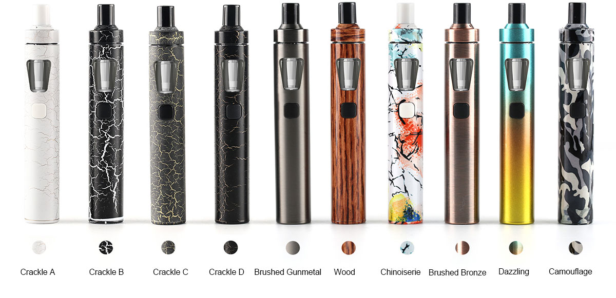 Joyetech eGo AIO Starter Kit brings 10 new colors for your option: Crackle A /Crackle B/Crackle C/Crackle D /Brushed Gunmetal/Wood/Chinoiserie/Brushed Bronze/Dazzling/Camouflage