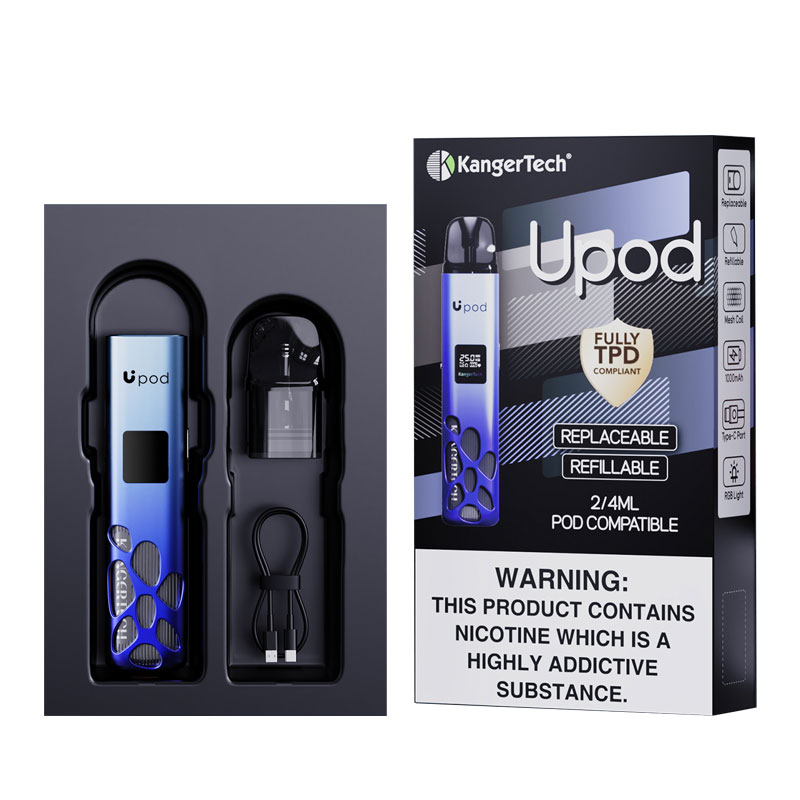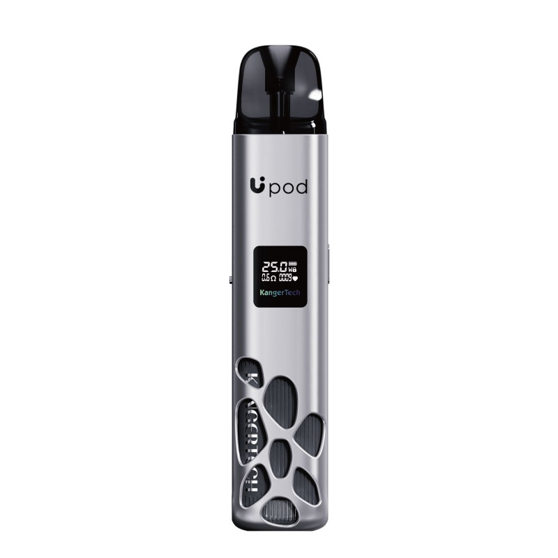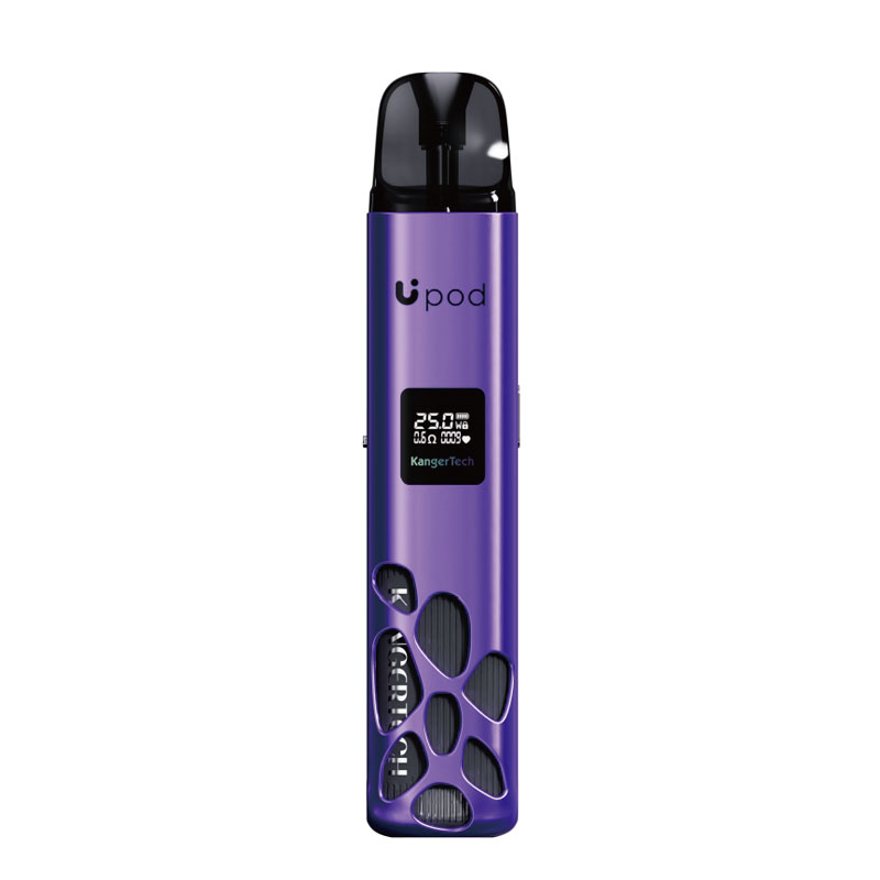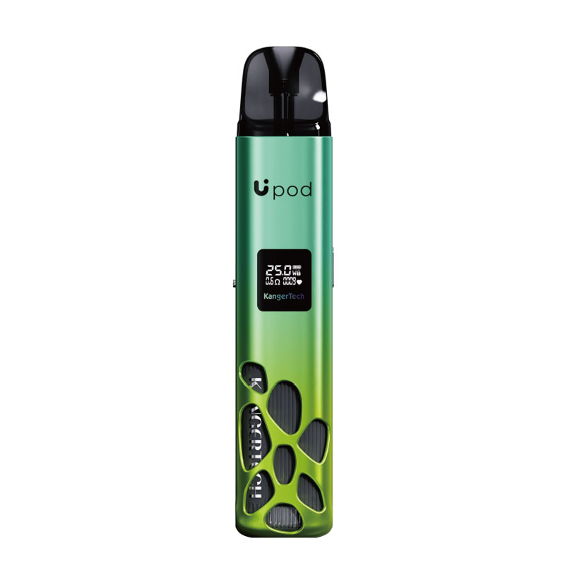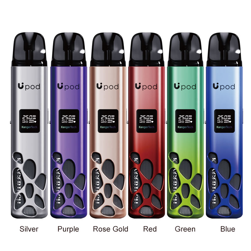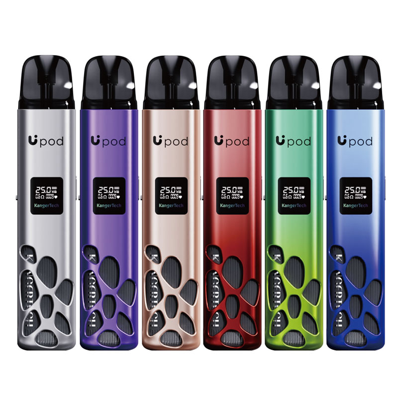 KangerTech Upod Kit is a stylish and compact vape kit, designed for both beginners and experienced vapers.The kit features a single button operation and a draw-activated firing mechanism, making it simple and convenient to use. The 0.96inch LED display screen provides clear information about battery life,resistance,puff count and other important details,The refillable pod has a magnetic connection and is compatible with two different pods 0.8ohm & 0.6ohm with bottom filling,The kit also has a built-in 1000mAh rechargeable battery and a wattage output range of 1-25W, making it ideal for a variety of vaping styles. The device has several safety features, including short-circuit protection, low voltage protection, and lithium-ion protection. The TYPE-C Fast charging port makes it easy to charge the device.