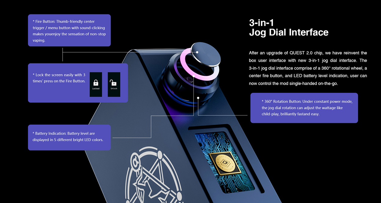 After an upgrade of QUEST 2.0 chip , we have reinvent the box user interface with new 3-in-1 jog dial interface . The 3-in-1 jog dial interface comprise of a 360 rotational wheel , a center fire button . and LED battery level indication . user can now control the mod single-handed on-the-go