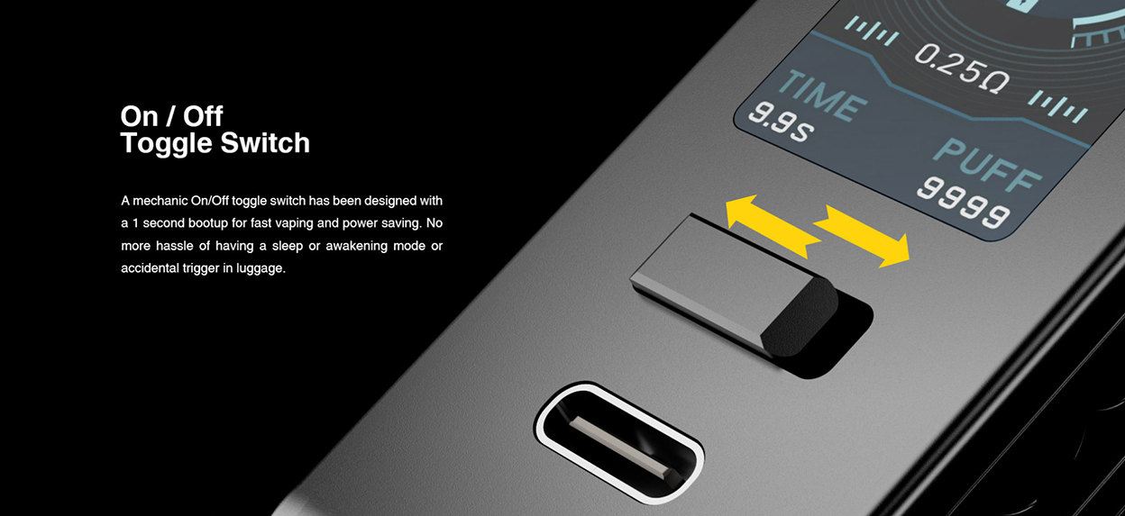 A mechanic On / off toggle switch has been designed with 1 second bootup for fast vaping and power saving . No more hassle of having a sleep or awakening mode or accidental trigger in luggage