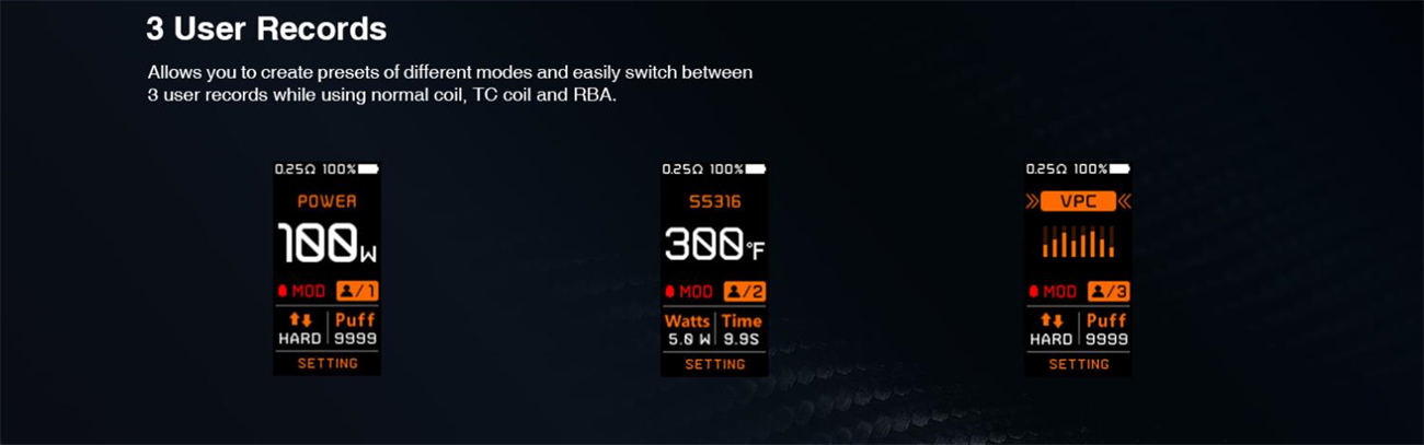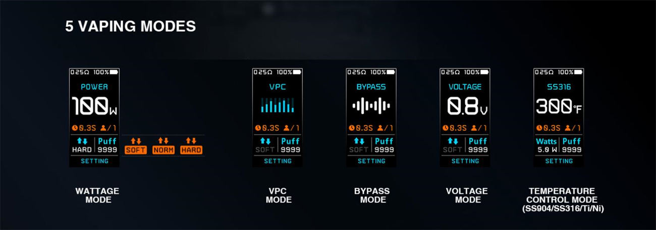Lost Vape Thelema Solo 100W Box Mod is powered by single 21700/18650 battery with max 100W output(with 21700 battery). Lost Vape Thelema Solo 100W Mod features Modern Quest 2.0 chip with multi protections and 0.96 inch TFT color display with 6 color schemes, easy to operate. Lost Vape Thelema Solo supports VW/ Power/ TC-SS994/ TC-SS316/ TC-Ni/ TC-Ti/ VPC/ Bypass modes to meet different needs. And Thelema Solo is compatible with up to 28mm tanks by 510 thread.