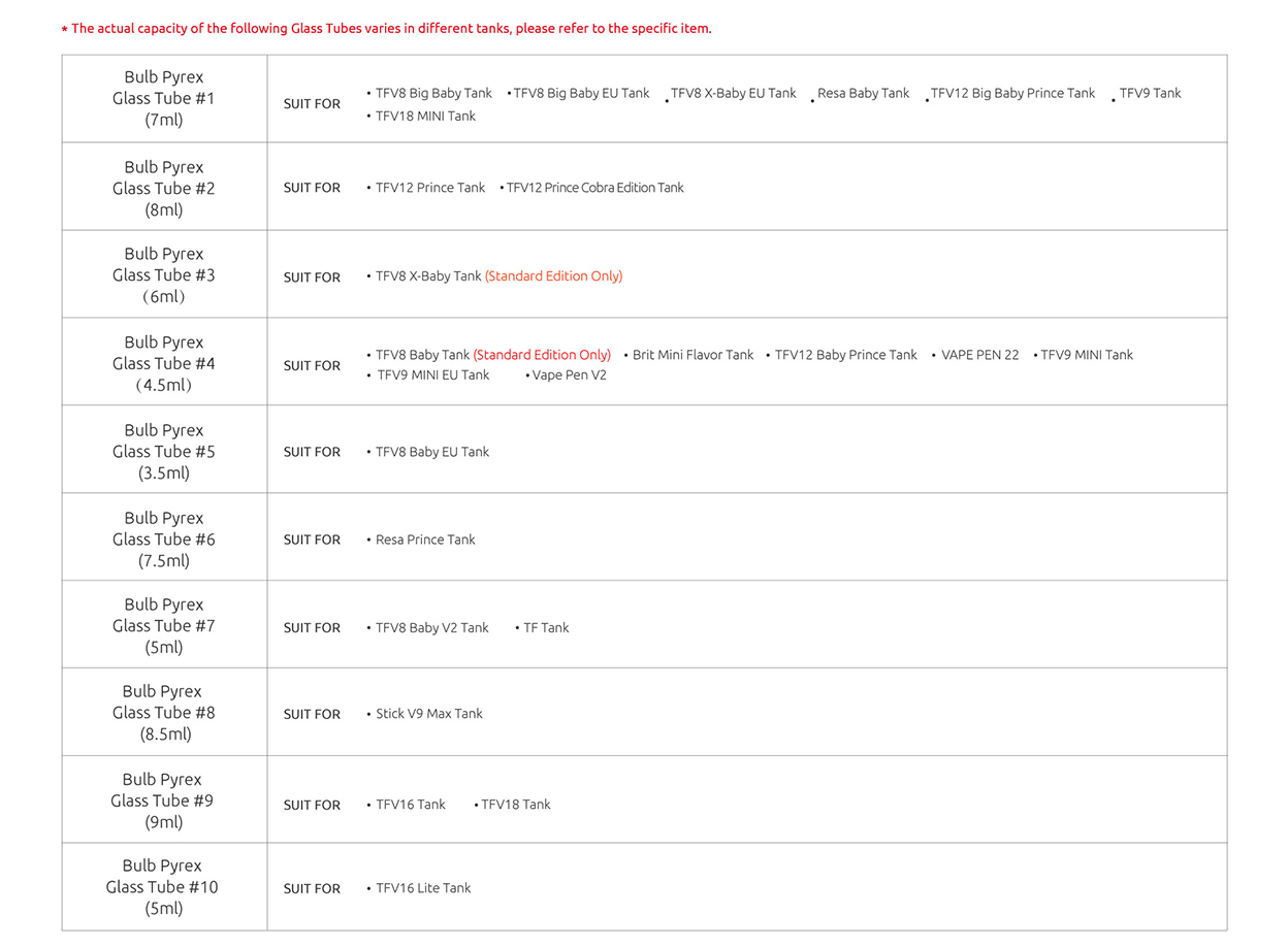 The replacement glass tube is custom designed for Smok TFV8 Baby Tank Atomizer( Silver & Black/Gun metal/Rainbow/Gold & Blue/Purple & Pink) & TFV12 Baby Prince