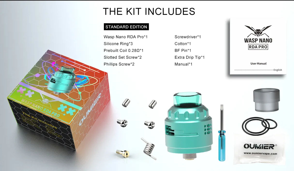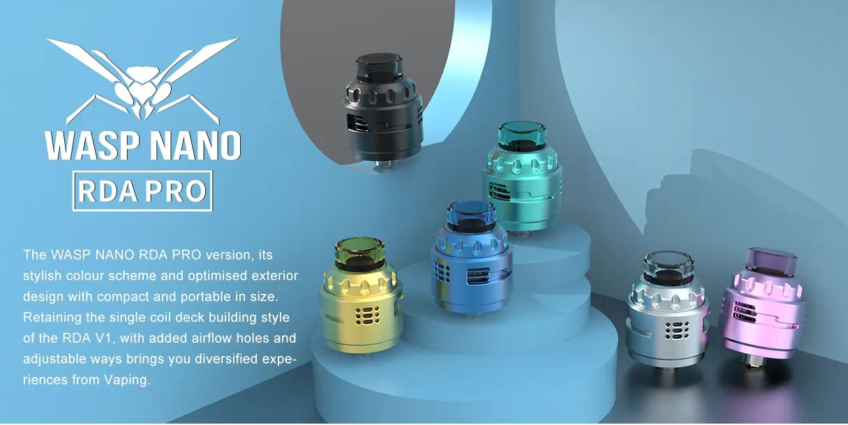 The WASP NANO RDA PRO version . its stylish colour scheme and optimised exterior design with compact and portable in size .Retaining the single coil deck building style of the RDA V1 . with added airflow holes and adiustable ways brings you diversified expe riences from Vaping.