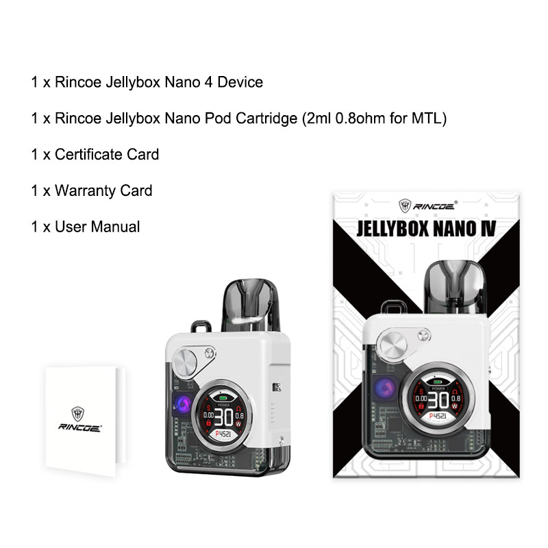 Rincoe Jellybox Nano 4 Pod System Features Power By Built-in 1400mAh Battery, 30W Maxoutput And 2ml Capacity.Compatible With Rincoe Manto Nano Replacement Pod Cartridges.