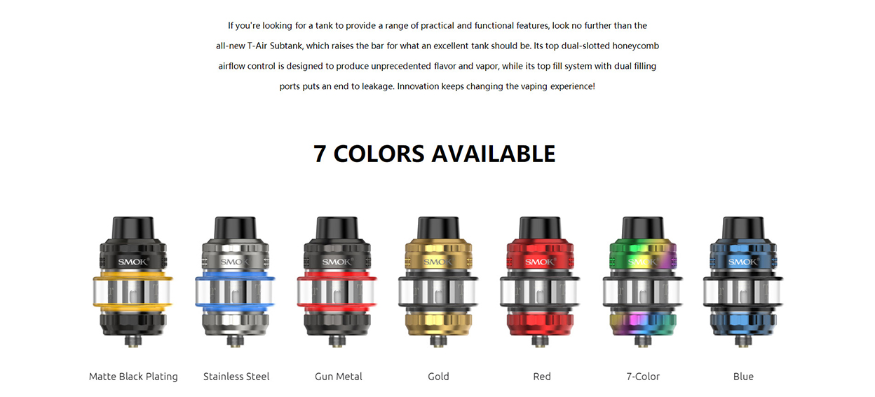 If you’re looking for a tank to provide a range of practical and functional features, look no further than the all-new T-Air Subtank, which raises the bar for what an excellent tank should be. Its top dual-slotted honeycomb airflow control is designed to produce unprecedented flavor and vapor, while its top fill system with dual filling ports puts an end to leakage. Innovation keeps changing the vaping experience!
