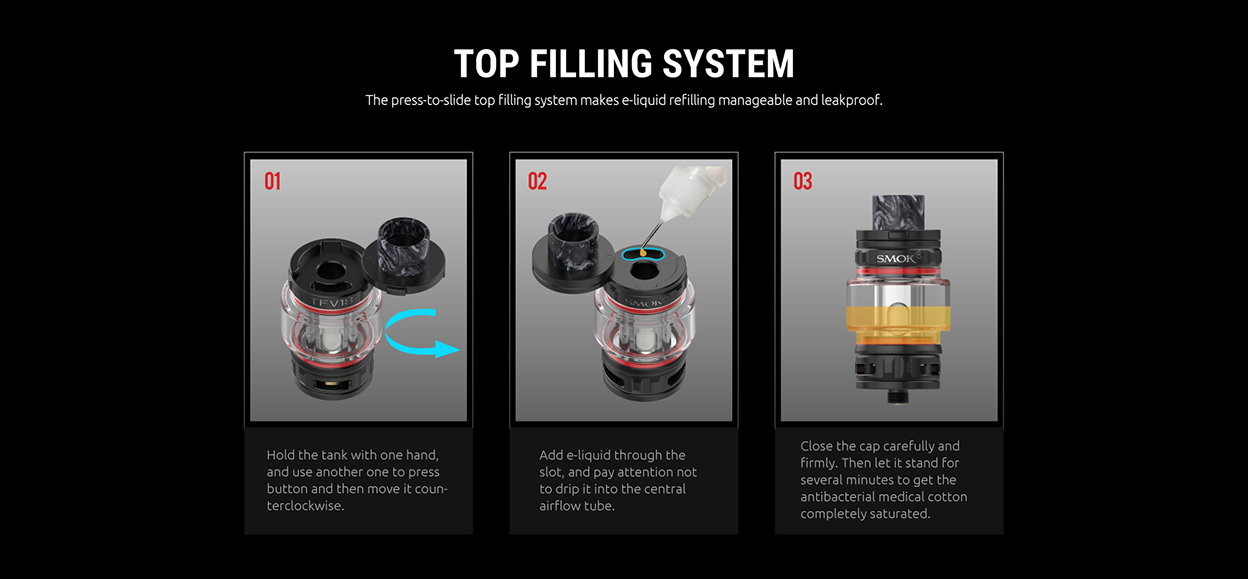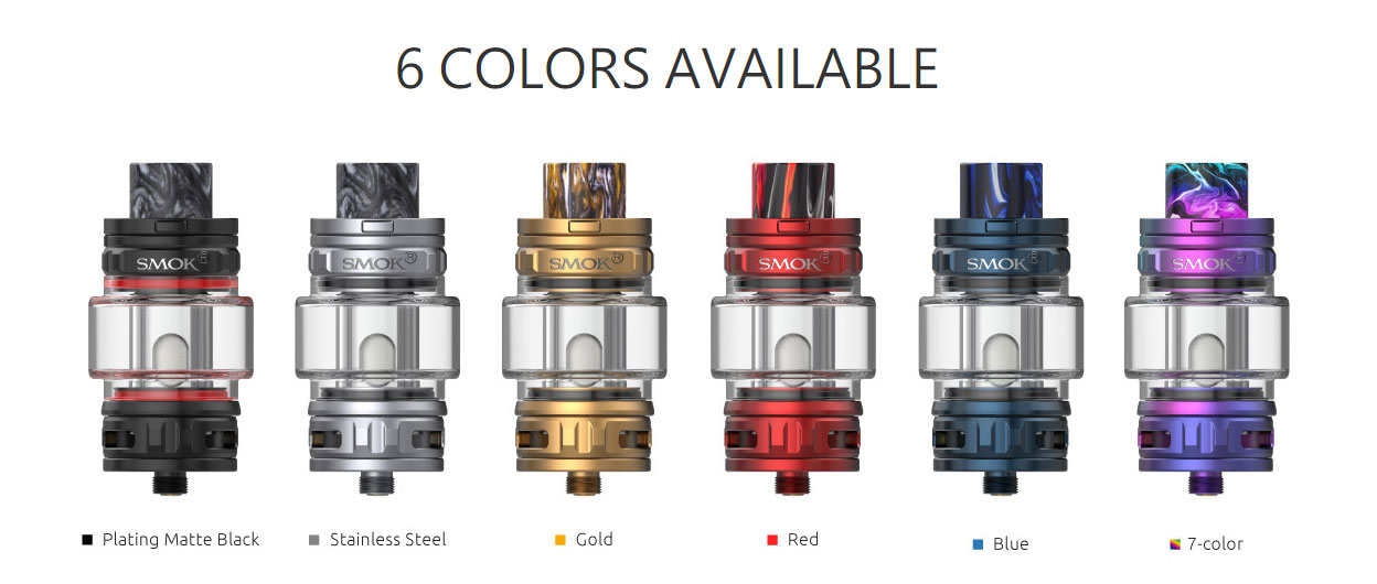 Capacity: 7.5ml (with TFV18 Meshed 0.33ohm Coil) / 6.5ml (with TFV18 Dual Meshed 0.15ohm Coil)