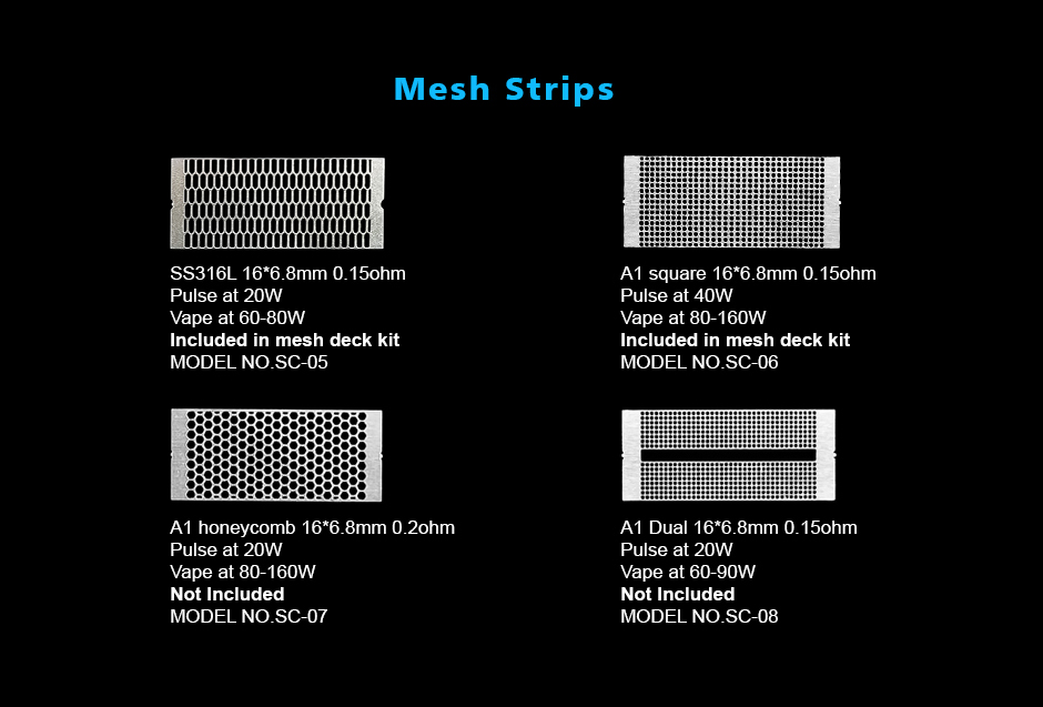 Coil: SS316L 0.15ohm, Kanthal A1 0.15ohm, A1 Honeycomb 0.2ohm, A1 Dual 0.15ohm