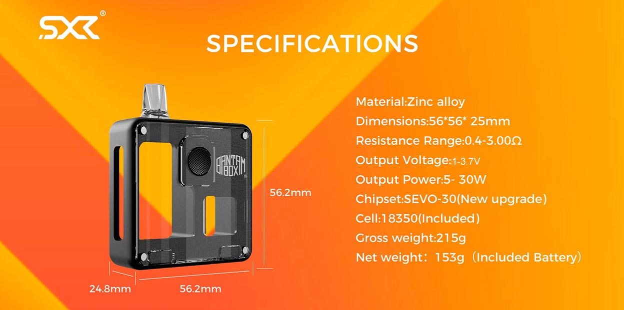 The Authentic SXK Bantam V3 AIO Boro Box Mod Kit is made from zinc alloy and powered by 1 * 18350 battery (not included). The Boro mod kit is with New upgrade SEVO-30 chipset and supports VW 5 – 30W. The Authentic SXK Bantam V3 AIO Boro Box Mod Kit is Compatible with BB / Billet Boro Tank (not included).