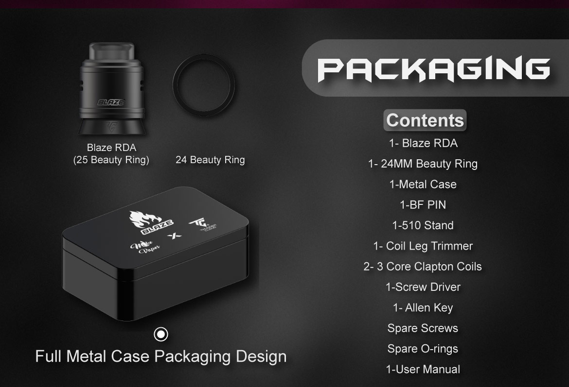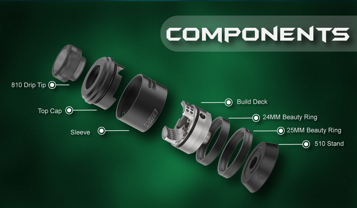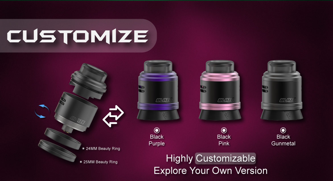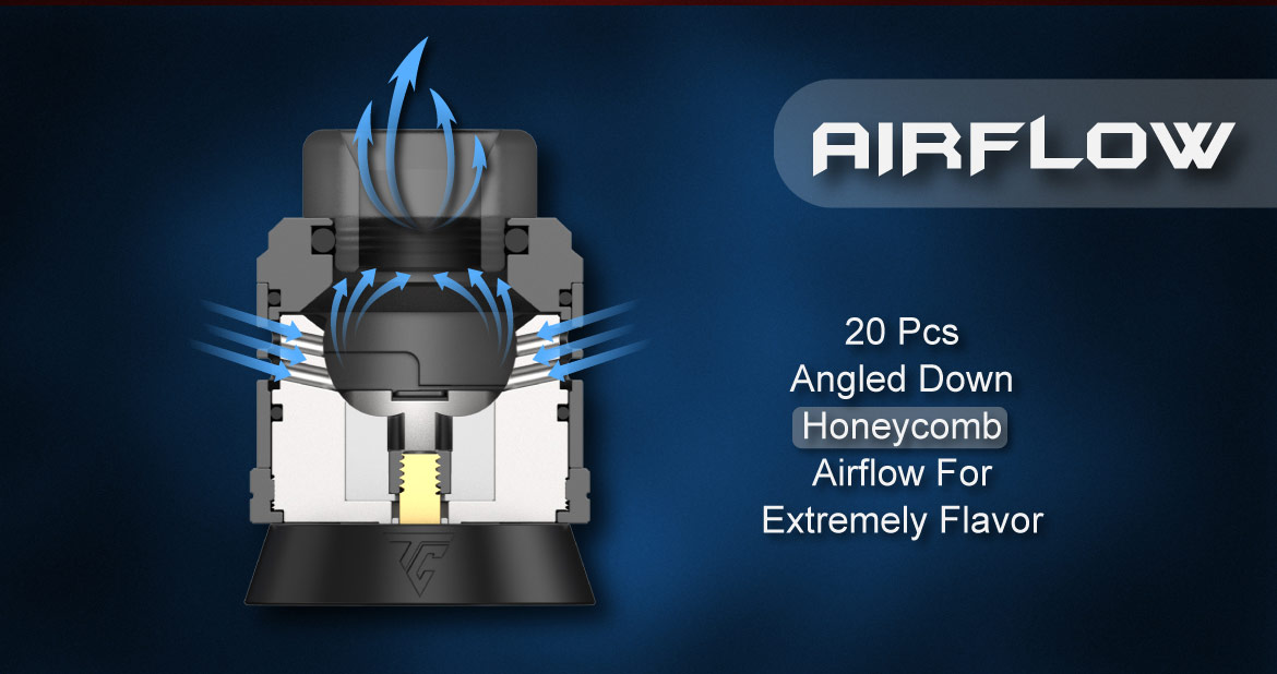 Thunder Cloud Blaze Dual RDA is designed by Mike Vapes and is engraved with the name of the model, supplied with a single coil & dual coils postless build deck with a ā€œVictorā€ curve. The air inlets on the side are angled downwards and feature a surrounding airflow design, the top cap is easier to rotate at the side to adjust the airflow, and there are also 20pcs honeycomb air holes around to produce fantastic dense vapor. The finish is understated and discreet, Blaze rda holds up to 2ml e-juice and can be refilled via dripping and squonk mod. Accessing its 4-grab screws and postless build deck, it is not difficult by using a screwdriver to build your coil.