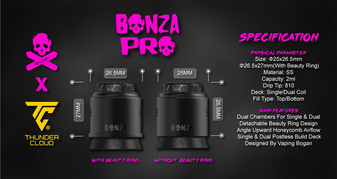 Bonza Pro RDA Features Dual & Single Coil Use,Improved Airflow,Compatible With Squonk Mods.