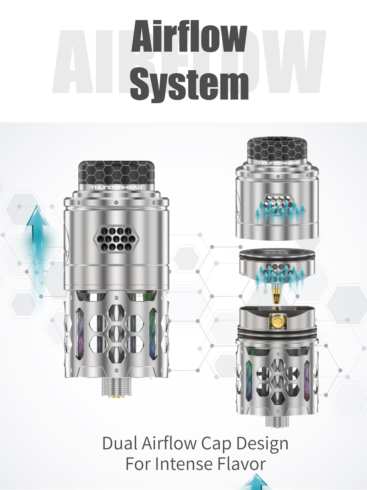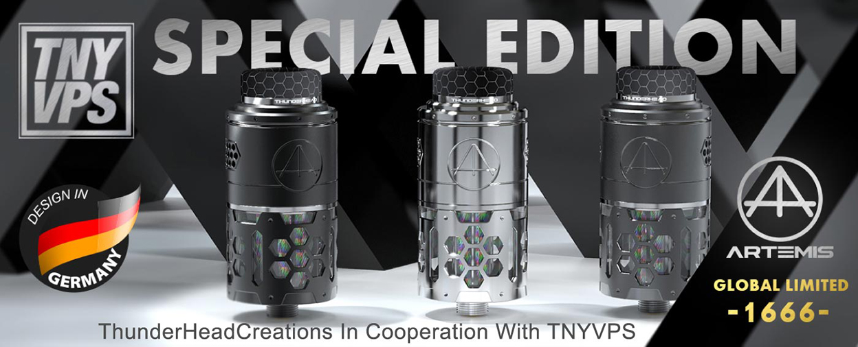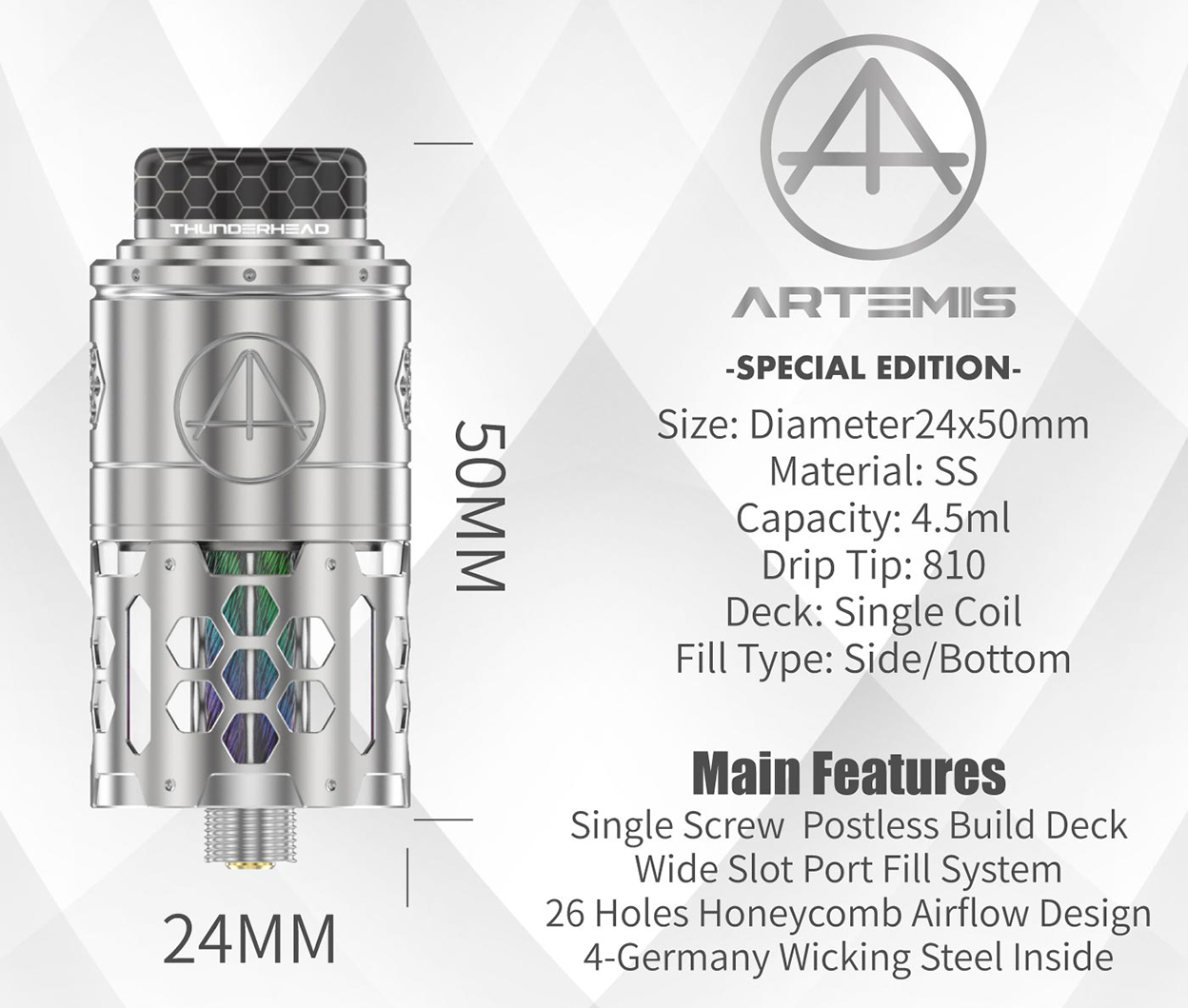 ThunderHead Creations Artemis RDTA Special Edition is the GLOBAL LIMITED edition and quantity 1666pcs only, collaborated with TNYVPS and breaking through itself from its standard edition and create a new, artistic, and design RDTA. Compared to the Standard, it earns awesome craftwork from its stylish engraving from both the exterior and interior, adding the newly designed LOGO engraving and honeycomb engraving at the bottom, as well as updating its silver-plated build deck and matt finishing. The main 4-Germany rainbow standard wicking steel differs from its black standard, view from honeycomb glass shield, it enormously creastes the huge cloud and aftertaste.