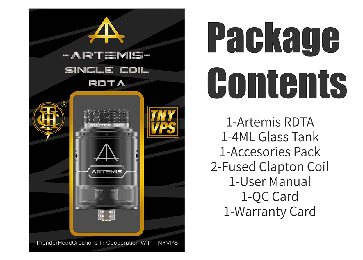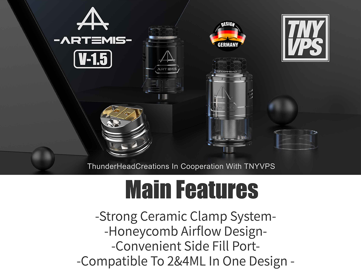 ThunderHead Creations Artemis RDTA V1.5 Comes With Postless Build Deck Featuring With Strong Ceramic Clamp System.