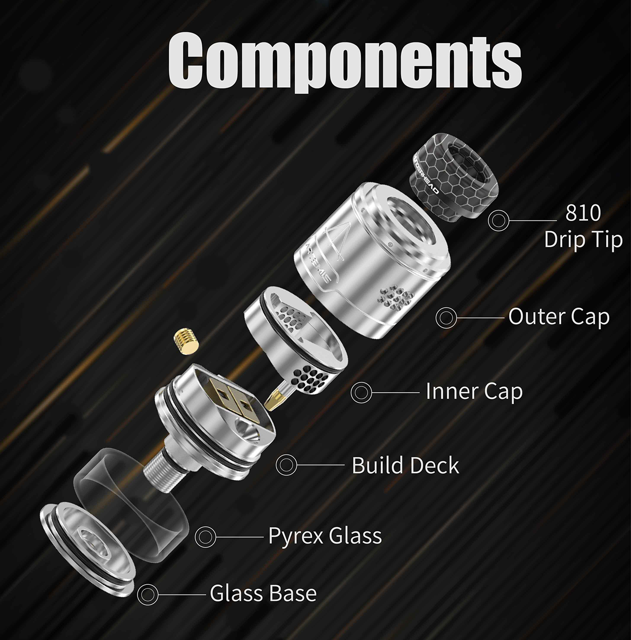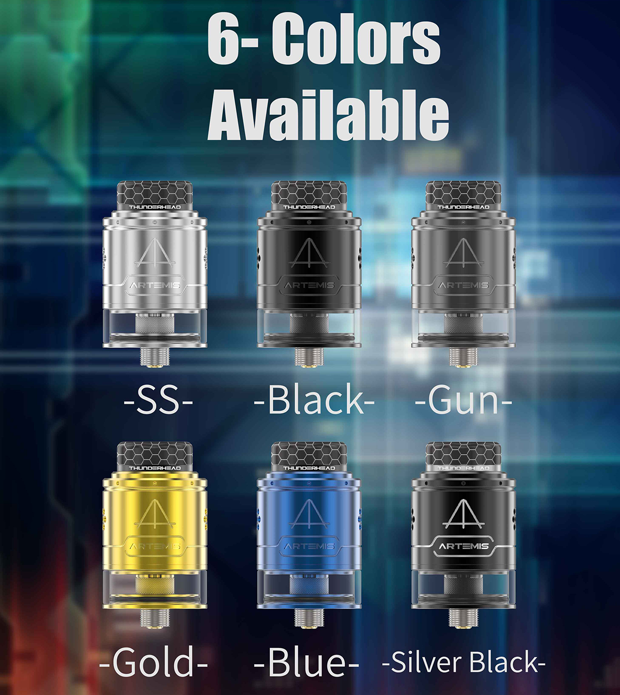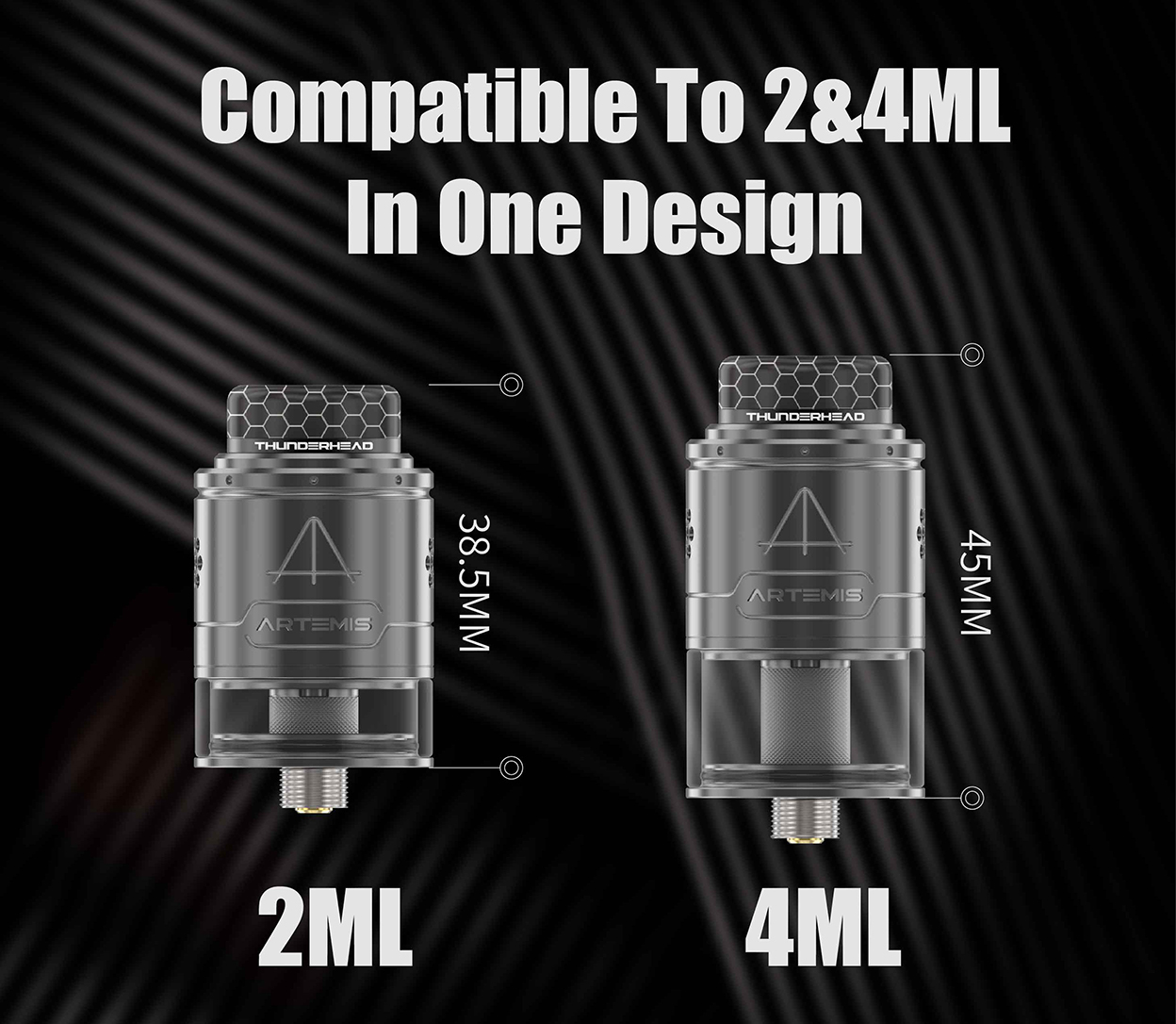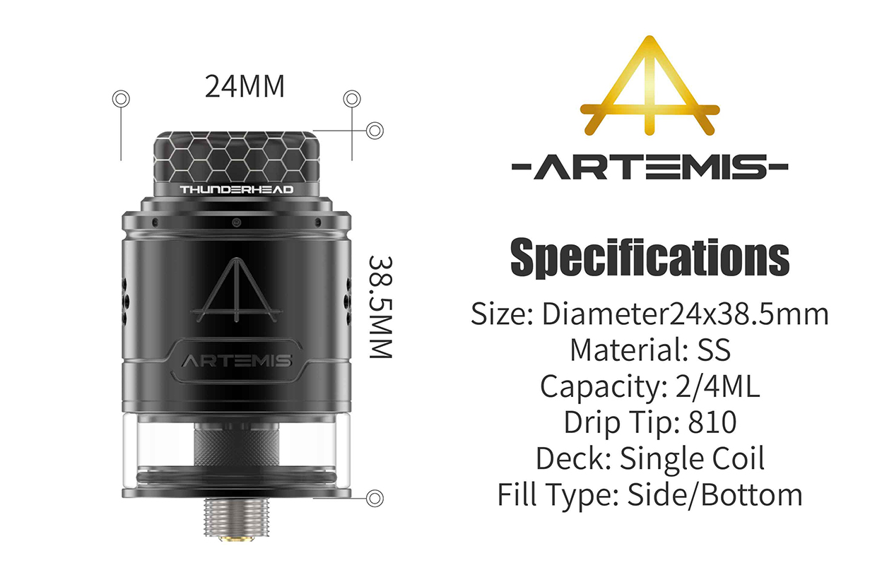 ThunderHead Creations Artemis RDTA V1.5 comes with postless build deck featuring with strong ceramic clamp system.There are 26pcs honeycomb airholes from double sides to provide excellent flavor and strong throat hit.Super easy to refill with wide slot design.It also compatible to 2ml & 4ml capacity in one design.Bottom Fed 510 Squonk Connection.Extra BF pin is offered for daily vaping.
