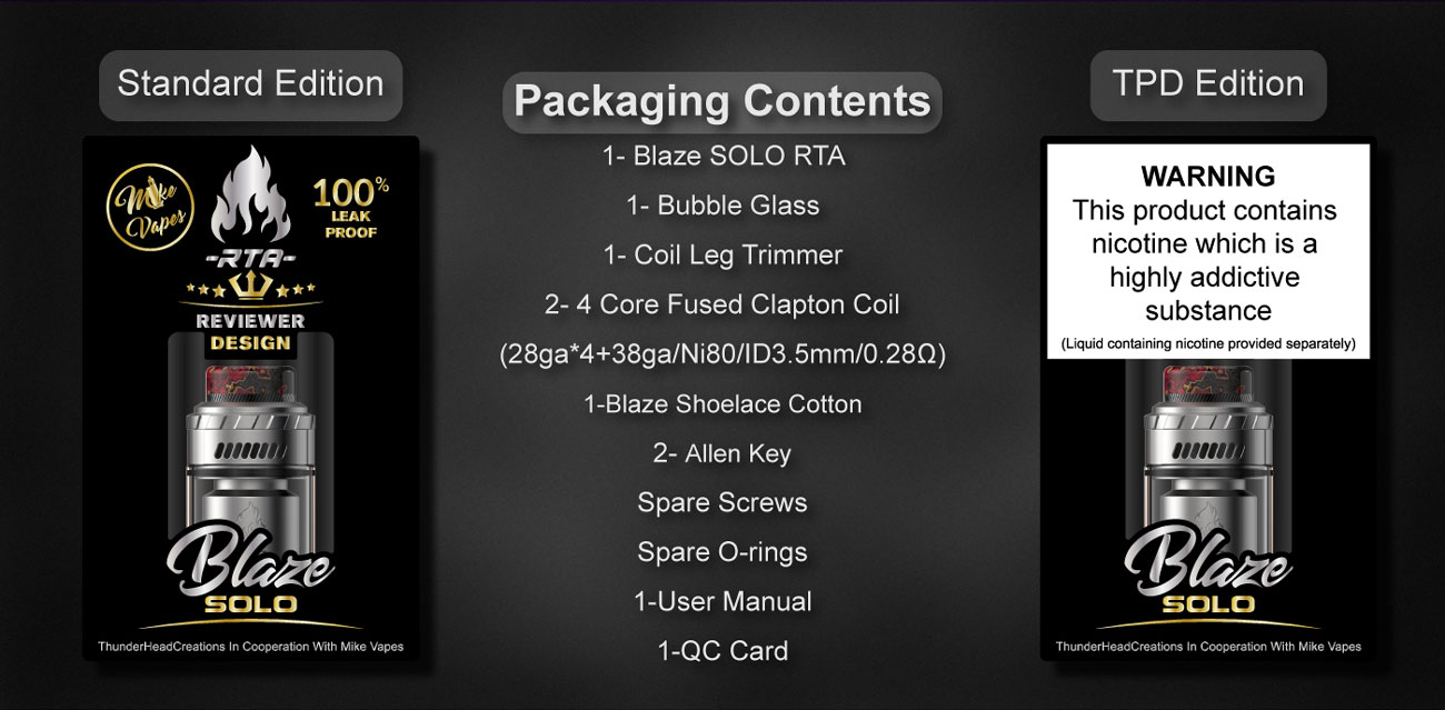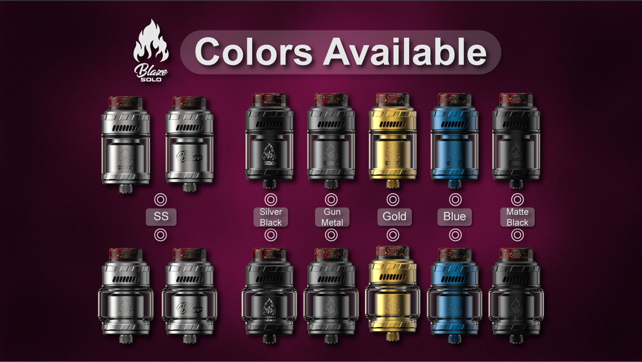 ThunderHead Creations Blaze Solo RTA Features A 5.5ml Vape Juice Capacity, A Top Filling System, And A Single Coil Configuration For A Large Cloud And Delicious Flavor.Honeycomb Side Airflow & Slotted Bottom Airflow.