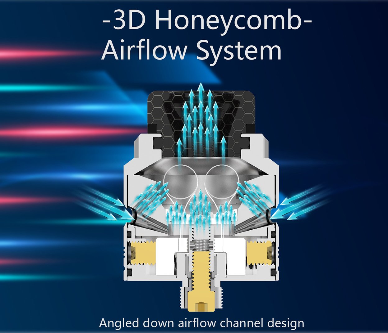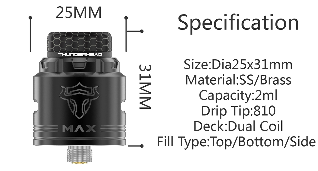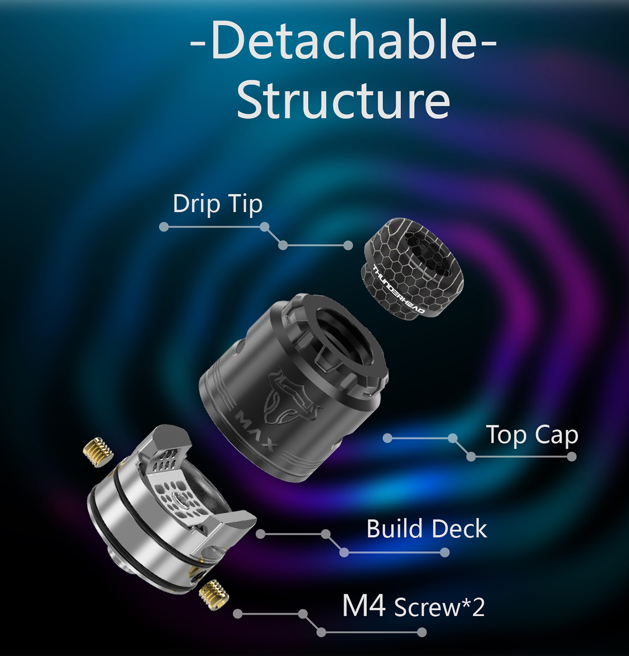 ThunderHead Creations (THC) – Tauren MAX RDA is a brand new postless dual coil RDA. It comes with innovative 3D honeycomb airflow system featuring with ceramic postless build deck. There are 26pcs airholes from triple sides to be as cloud chaser, moreover the 3D honeycomb provide excellent flavor and strong throat hit. Super easy to build due to the dual ceramic clamp system in the build deck. Extra BF pin is offered for daily vaping.