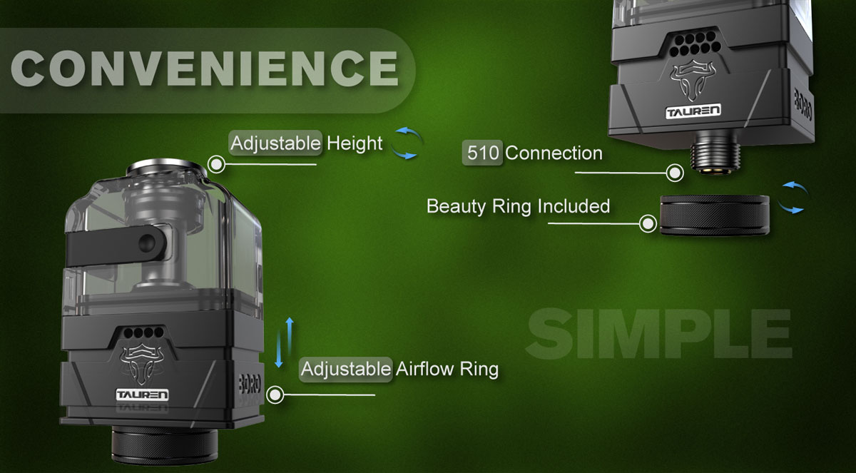 Moreover, the adjustable airflow ring insures you get your most favorable airflow, plus the 2 sides refill holes are super convenient for filling to bring you excellent user experience.