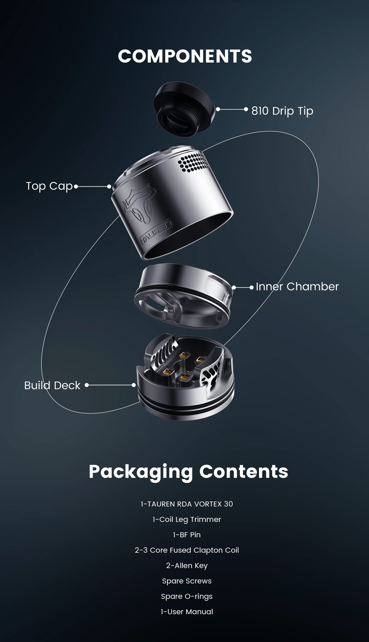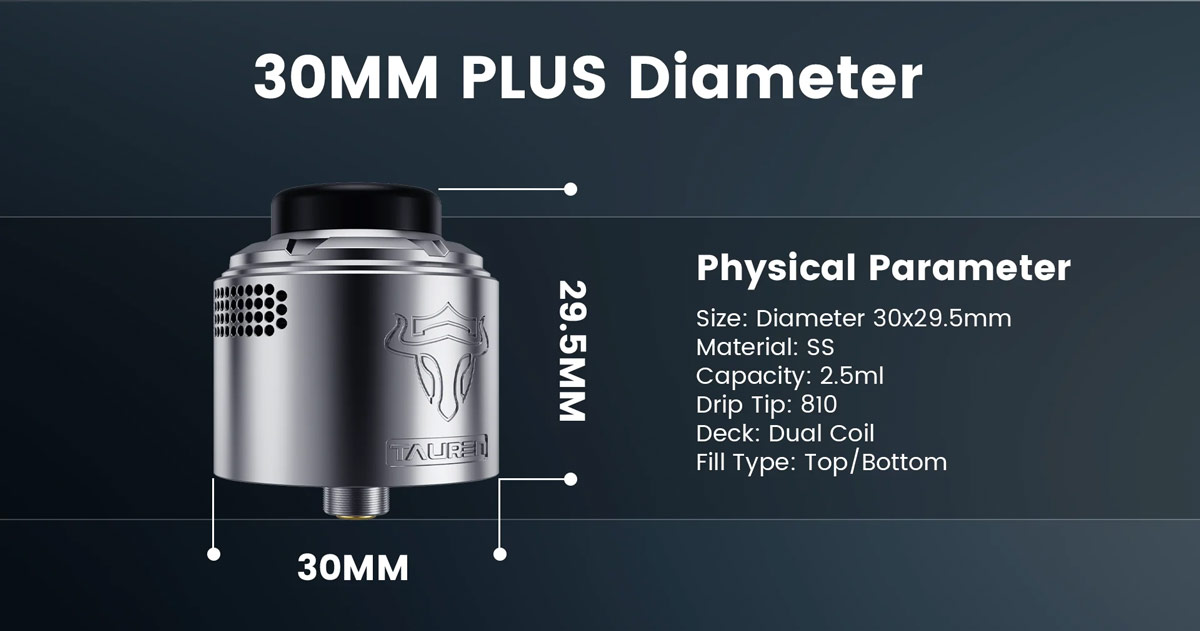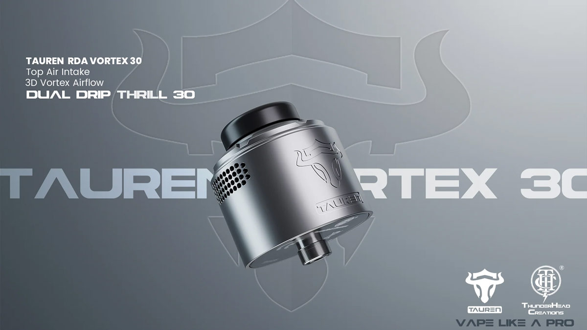 Thunderhead Creations Tauren Vortex 30 RDA Features 30mm Diameter, 2.5ml Capacity And A Dual Coil Deck.
