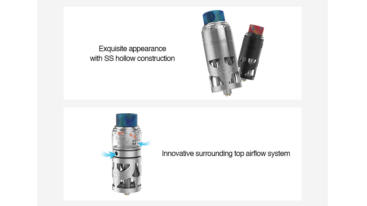 The Vapefly Brunhilde Top Coiler RTA Is An Exquisite Rebuildable Tank Atomizer With Optional 8ml E-juice Capacity And High Quality SS Hollow Construction. The Vapefly Brunhilde Top Coiler RTA Mainly Features Innovative Surrounding Top Airflow System, Which Can Bring Optimal Vaping Flavor And Tastes