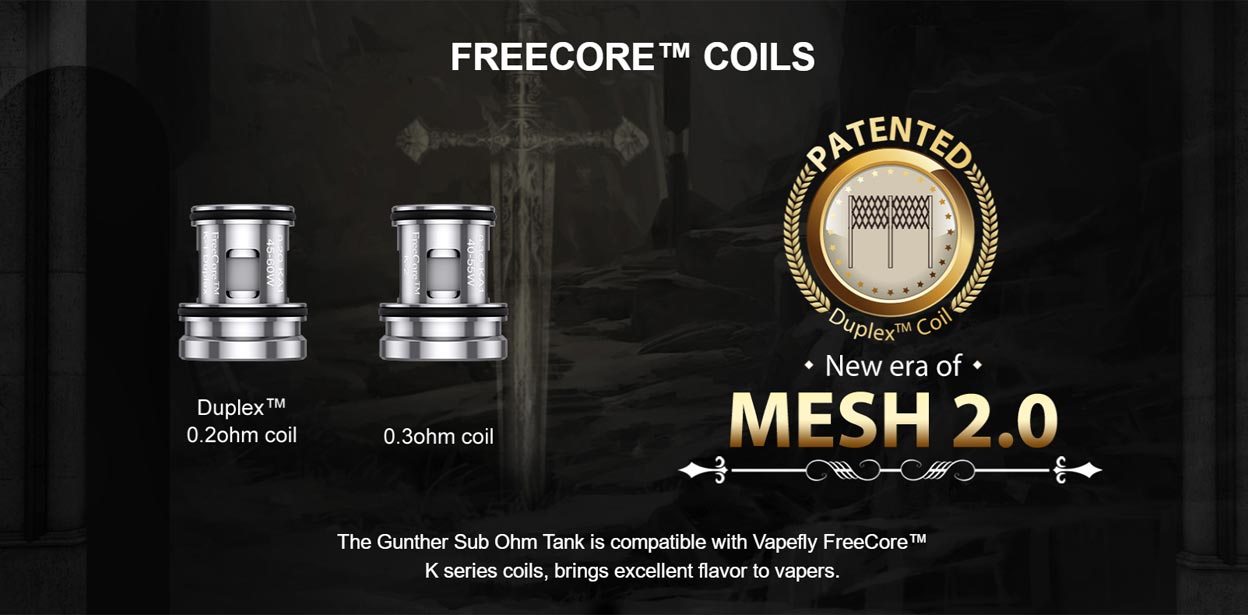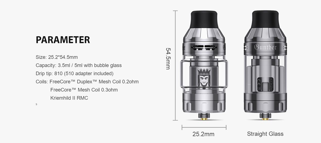 Vapefly Gunther Tank is a sub ohm tank that is designed with U-shaped top airflow to bring smooth, quiet and leakproof vaping. Compatible with FreeCore K series coils (Kriemhild II Coil) and Kriemhild II RMC, it will provide excellent flavor for you. Gunther Sub Ohm Tank can be refilled by top filling system and hold 3.5ml or 5ml e-juice capacity.
