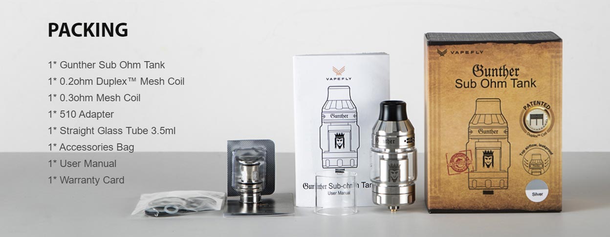 Vapefly Gunther Tank Is A Sub Ohm Tank That Is Designed With U-shaped Top Airflow To Bring Smooth, Quiet And Leakproof Vaping.