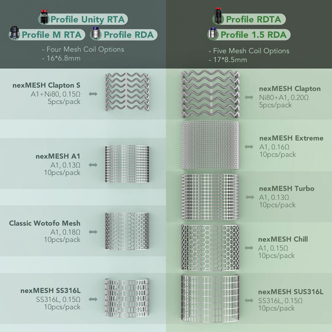 Tips: To cater to more vapers, 3 options of mesh coil have been included:nexMESH CHILL, nexMESH TURBO, and nexMESH EXTREME.Please note that the new mesh is not interchangeable with the original Profile RDA mesh in that its 1.4 times the area of the original one.