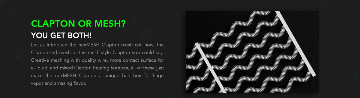 The Claptonized mesh or the mesh-style Clapton you could say . Creative meshing with quality wire , more contact surface for e-liquid , and mixed Clapton heating eatures , all of these just make the nex MESH Clapton a unique bad boy for huge vapor and amazing flavor .