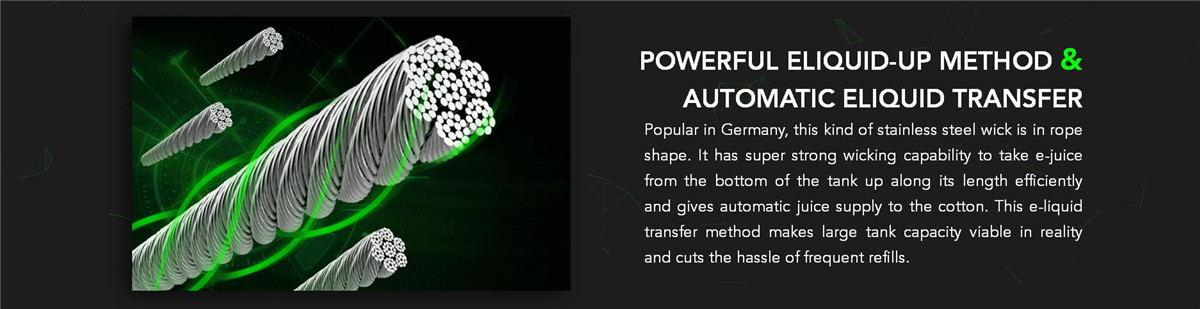 Popular in Germany , this kind of stainless steel wick is in rope shape . It has super strong wicking capability to take e-iuice from the bottom of the tank up along its length efficiently and gives automatic juice supply to the cotton This e-liquid transfer method makes large tank capacity viable in reality and cuts the hassle of frequent refills.