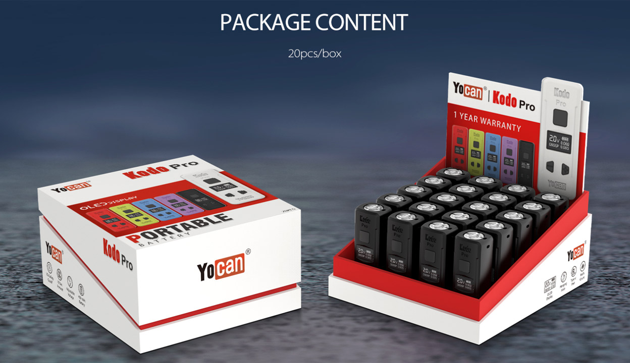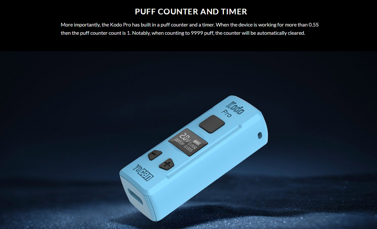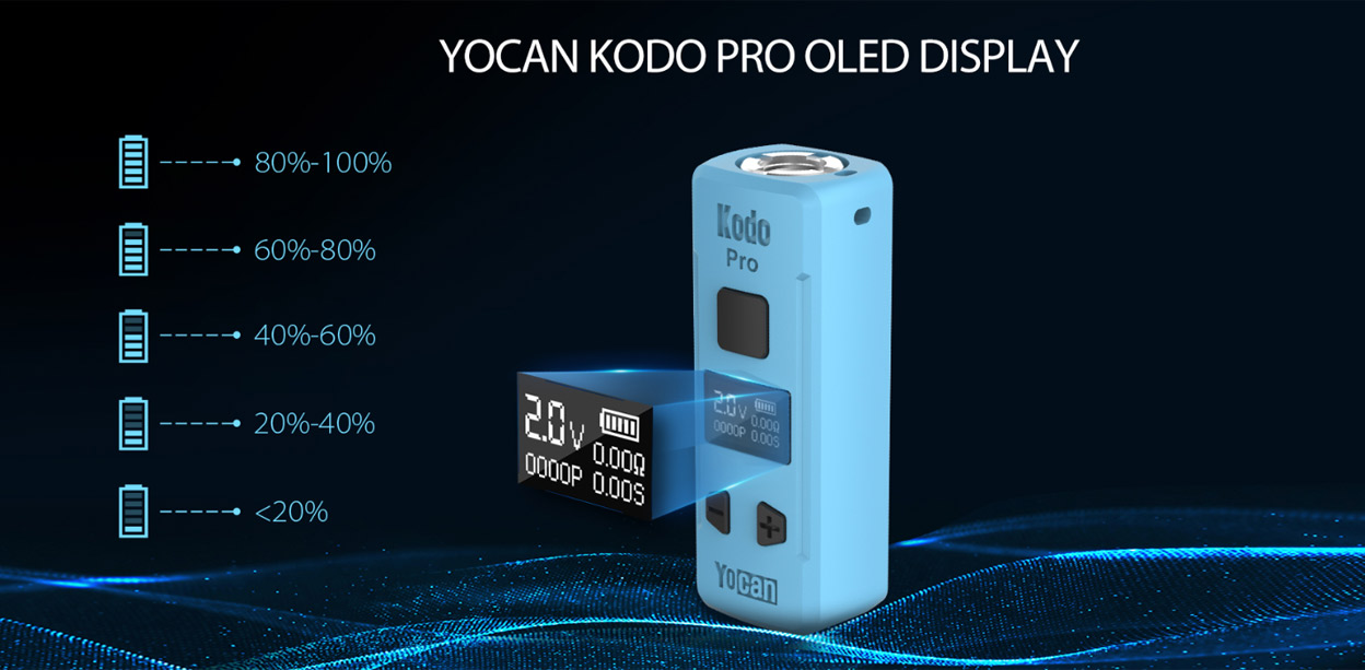 The Yocan Kodo Pro is a Vape Battery for Cartridges. It has a 510 thread to fit most cartridges on the market. Featuring a 400mAh battery, 1.8-4.2V output range, and 10 second pre-heat function. In addition, Kodo Pro battery is designed with a puff counter and a timer, OLED screen and type-c charging. The Yocan Kodo Pro is one of the tiniest vaporizers on the market, so it won’t take up much space in your pocket.