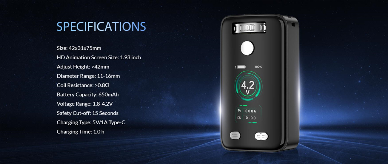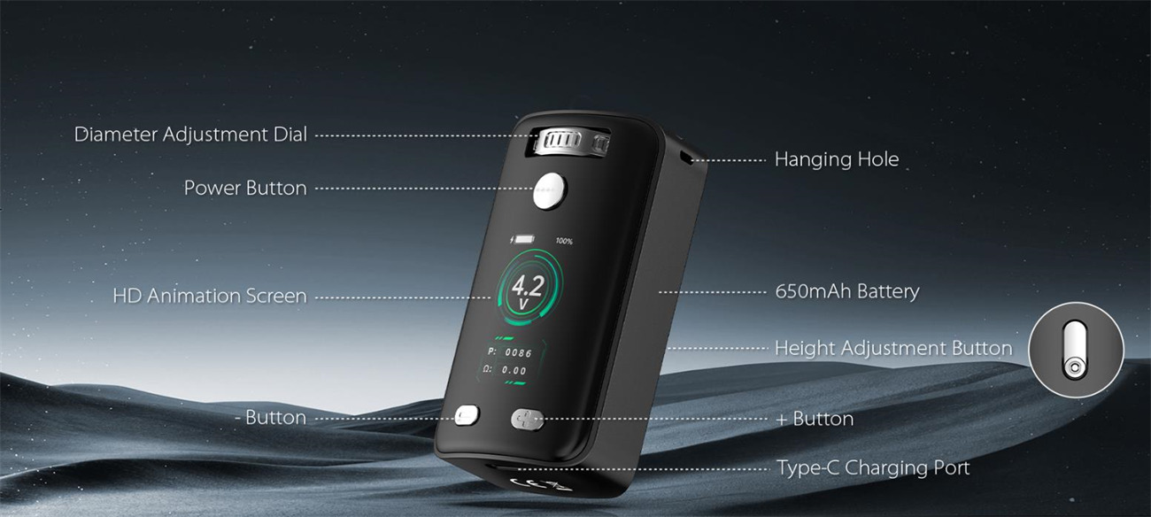 Yocan UNI 3.0 Mod is powered by a built-in 650mAh battery with Type-C charging to bring you long-lasting use and auto shutdown after 1 hour function for safe use. There are 3 UI modes(Classic, Planet, Shiny Cat) to customize your vaping. Designed with 1.93 inch HD animation screen, it provides real-time update on battery life, voltage, puff count and even features cool animations, making vaping an interactive experience. It is able to accommodate cartridges of different sizes with the adjustable height and width settings. It can warm up the cartridge for seconds at 1.8V so as to ensure smooth and consistent vapor production. Equipped with a practical hanging hole, it is super convenient and portable.