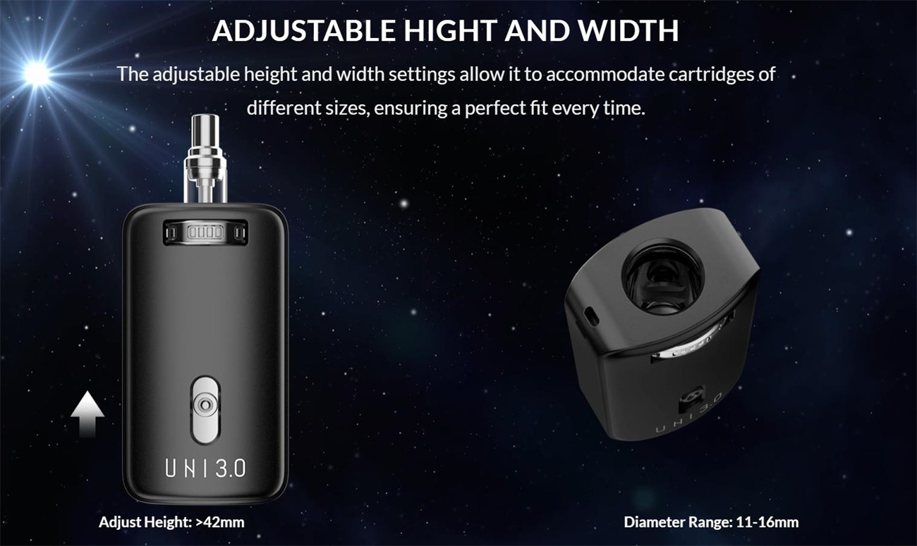 Yocan UNI 3.0 Box Mod Can Accommodate A Wide Variety Of Carts Thanks To Its Chamber That Has An Adjustable Height And Width. It Also Comes With Precision Voltage Settings, So You Can Really Dial Down Your Sessions To Suit Your Needs.
