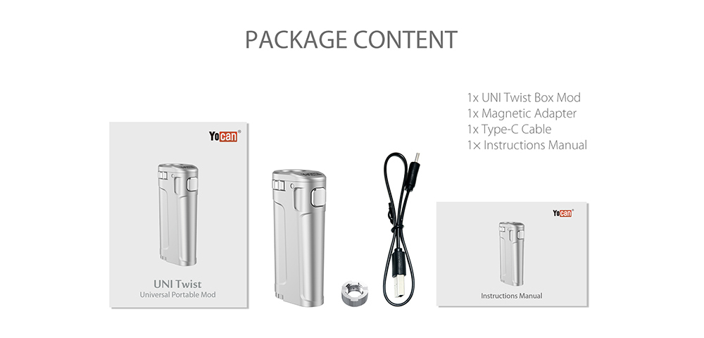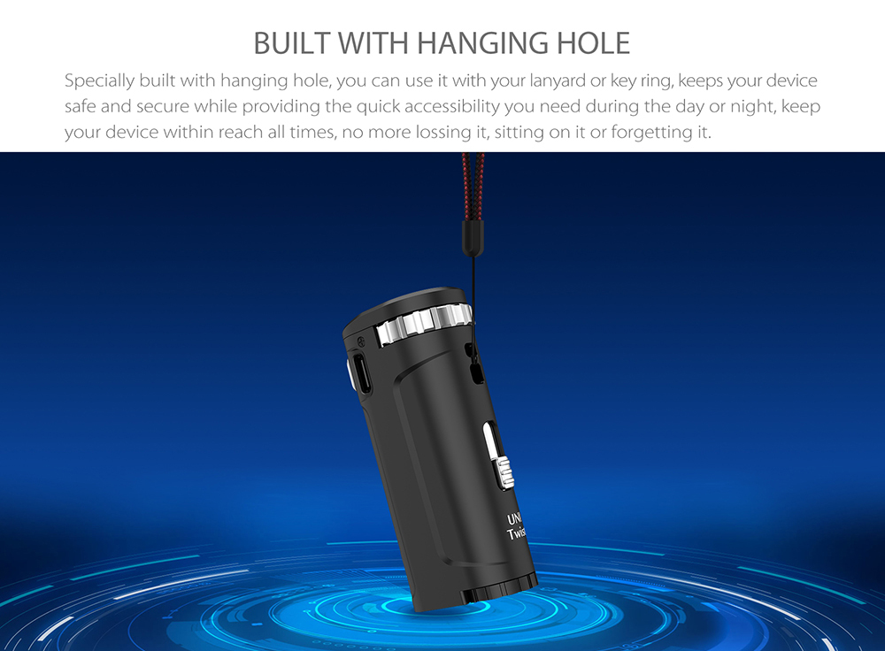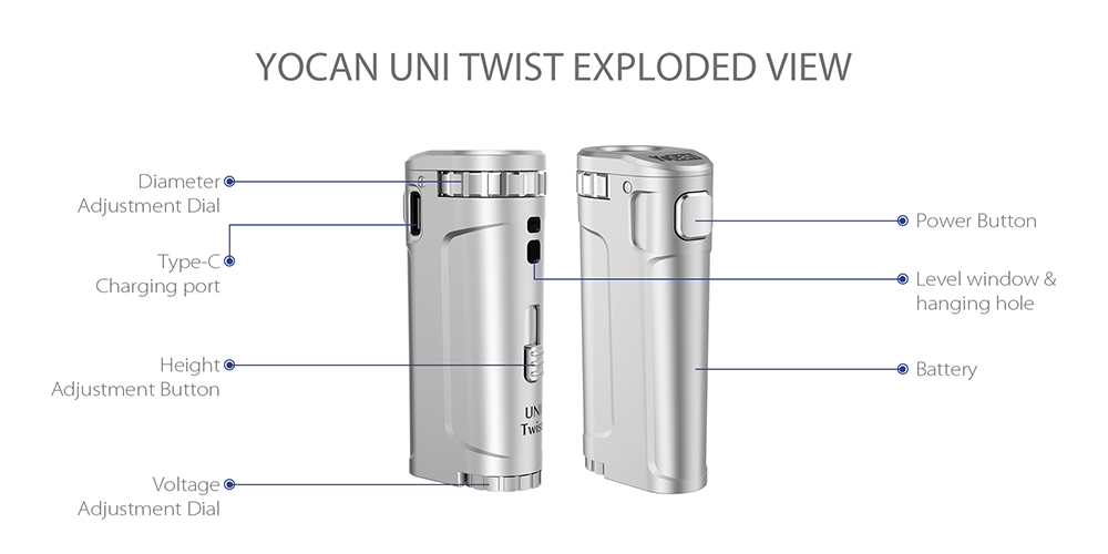 The Yocan UNI Twist is housed in solid quality Zinc Alloy shell which is durable and reliable. It can fit all kinds of oil atomizers with adjustable dial and height slider. And its 10sec preheat function can help you to prepare your materials before use. Rapidly click the power button 2 times will put the device in preheat mode. To deactivate, simply press the power button 2 times again. Powered by 650mAh built-in battery, it can be adjusted at voltage 1.8-4.2V by rotating the voltage adjustment dial at the bottom. Moreover,it adopts compact structure,and has a hanging hole for you to use a lanyard or key ring and carry conveniently.